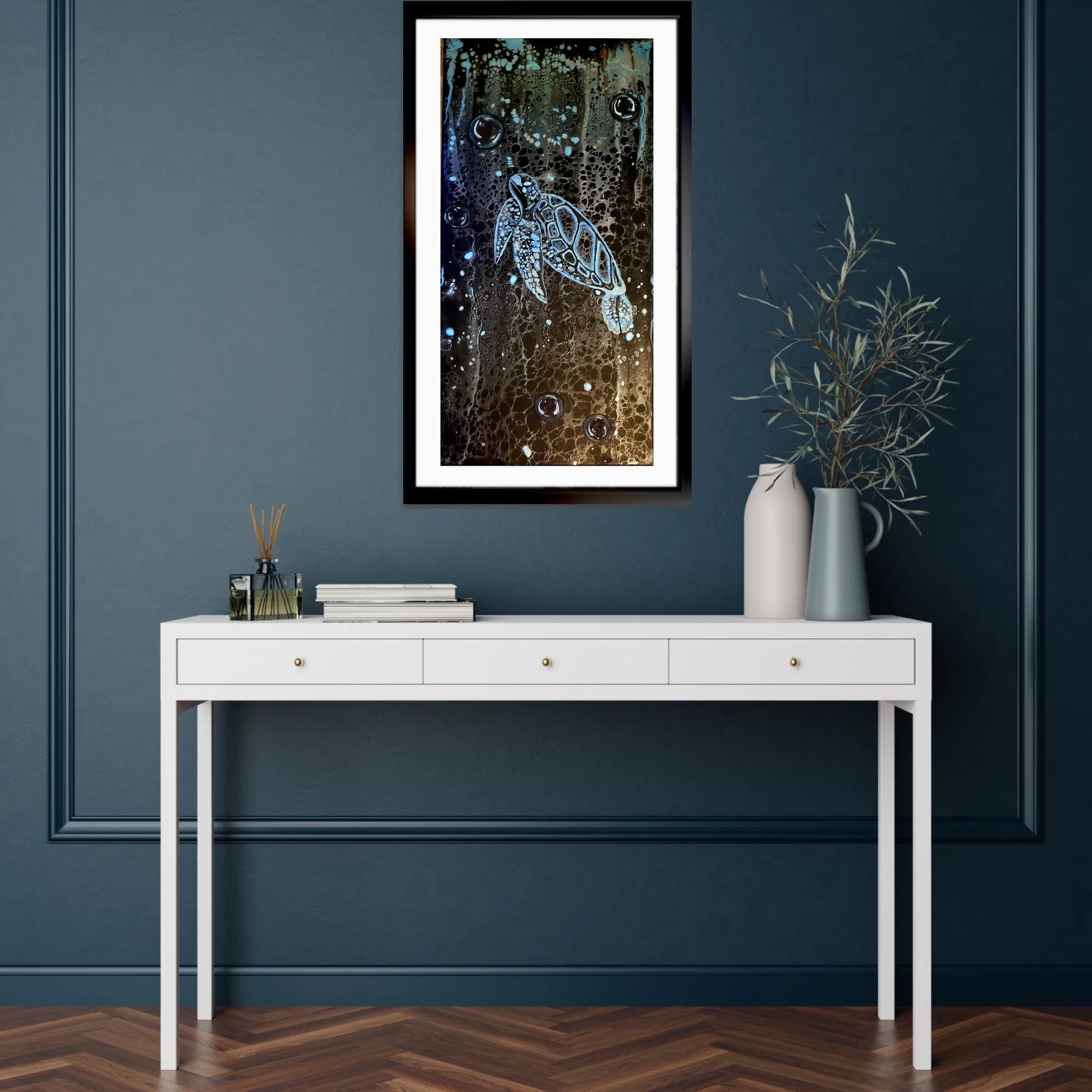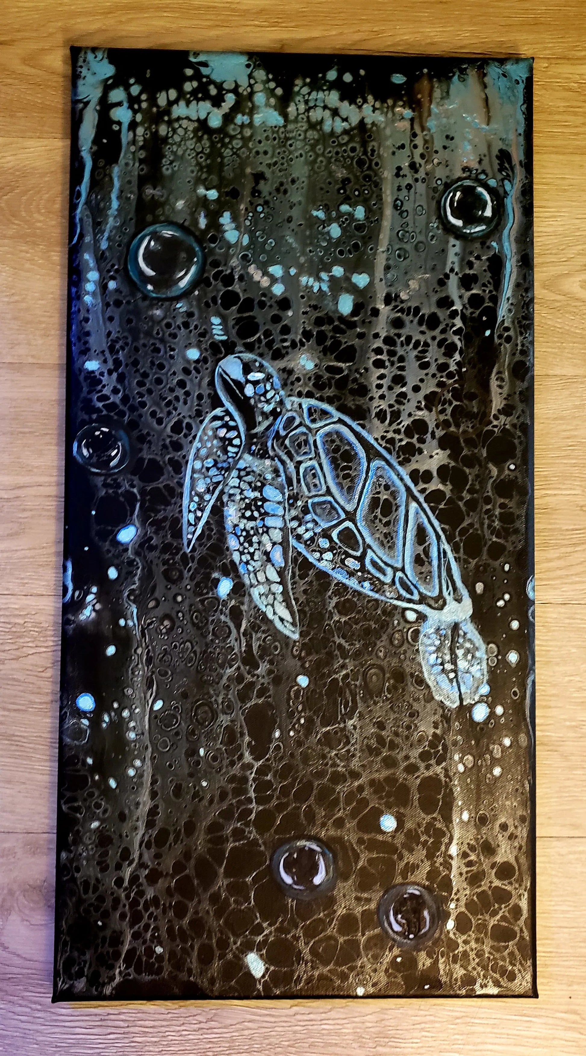 Elevate your interior decor with an Acrylic Pour Painting on canvas. This was inspired by the sea, created using a unique pouring technique that results in stunning abstract designs. A turtle swimming peacefully in the ocean surrounded by a variety of bubbles with blue and silver hues. Hang this painting in your home or office to add a burst of color and a touch of style. This piece will surely keep you gazing. Multi-layered gloss varnish applied for protection, appeal and durability. Frame not included.