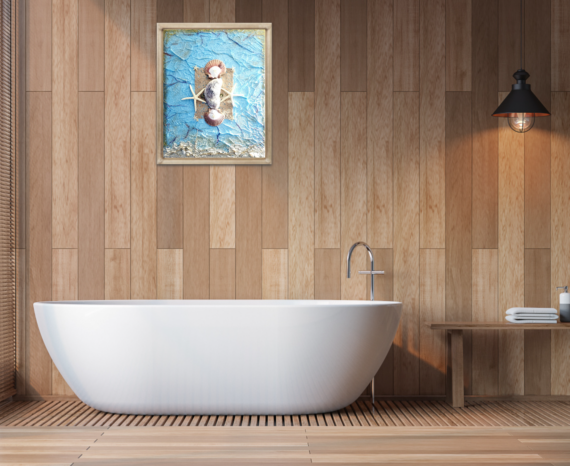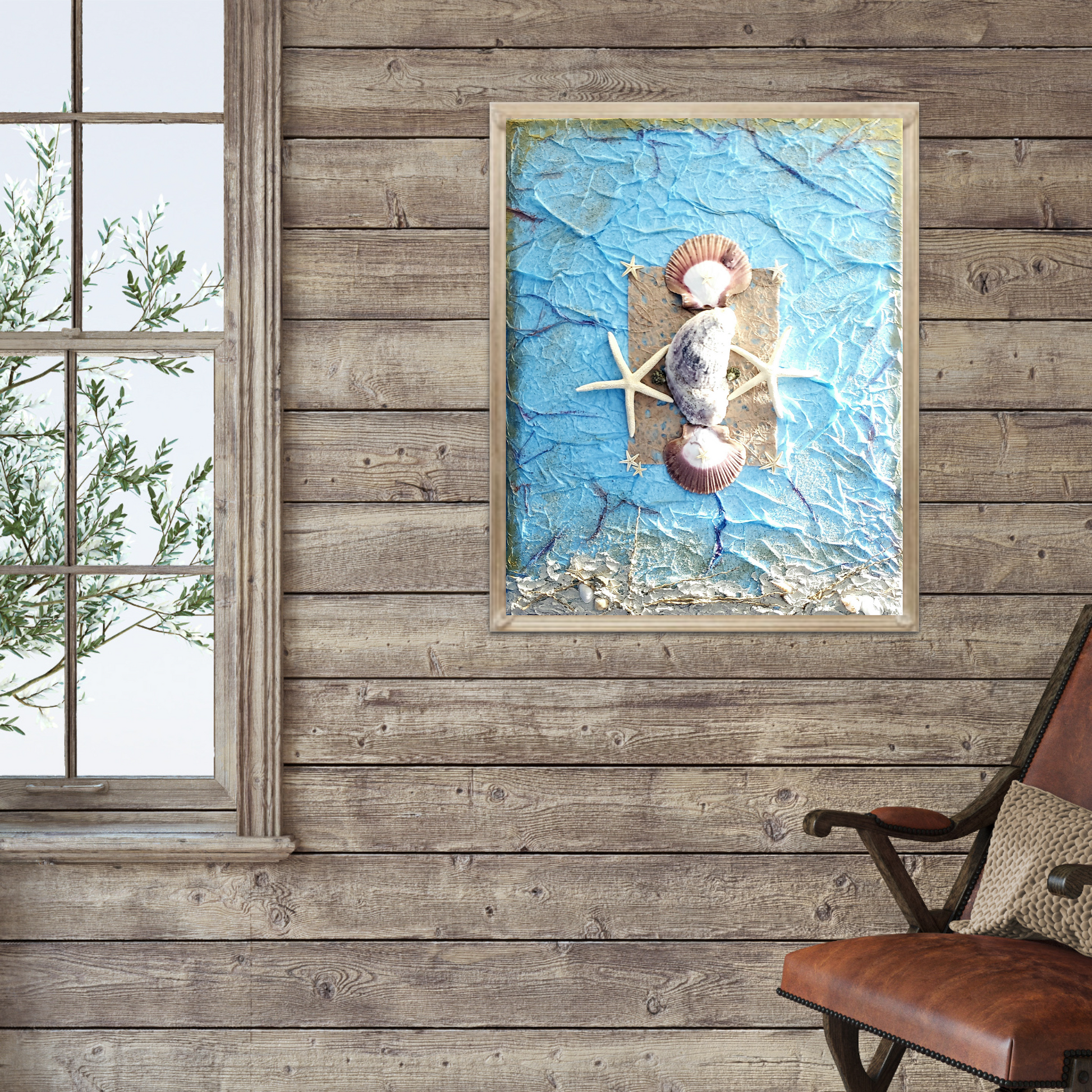 The soothing blue hues and delicate fragile details bring a sense of tranquility to a room. The center of the canvas displays an interesting, large shell surrounded by starfish. Sea themed embellishments including real sand, raised textured lines, starfish and more. Wavey blue raised lines spread across the canvas creating an intriguing appeal. Gold boarder frame details, hand painted. Frame not included.