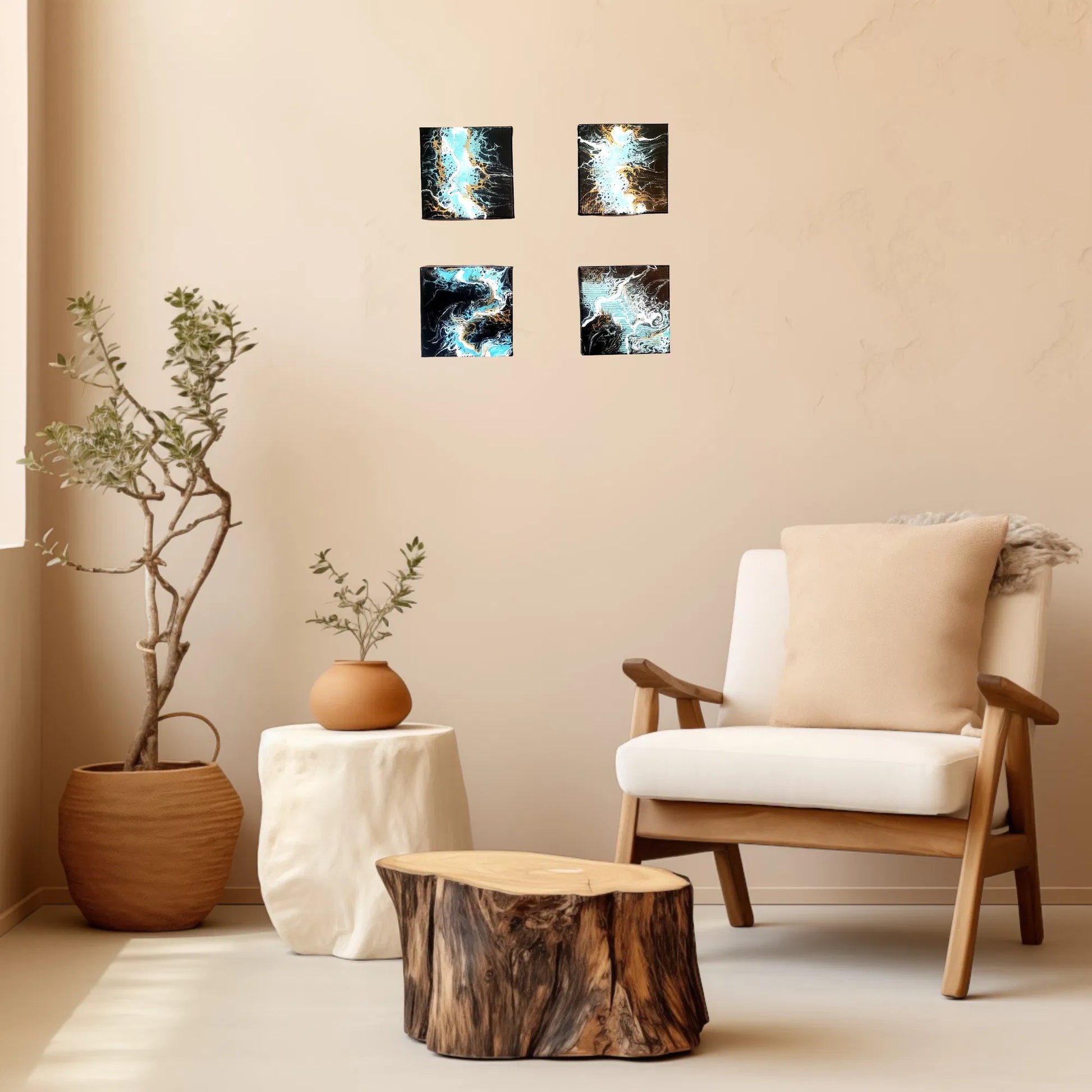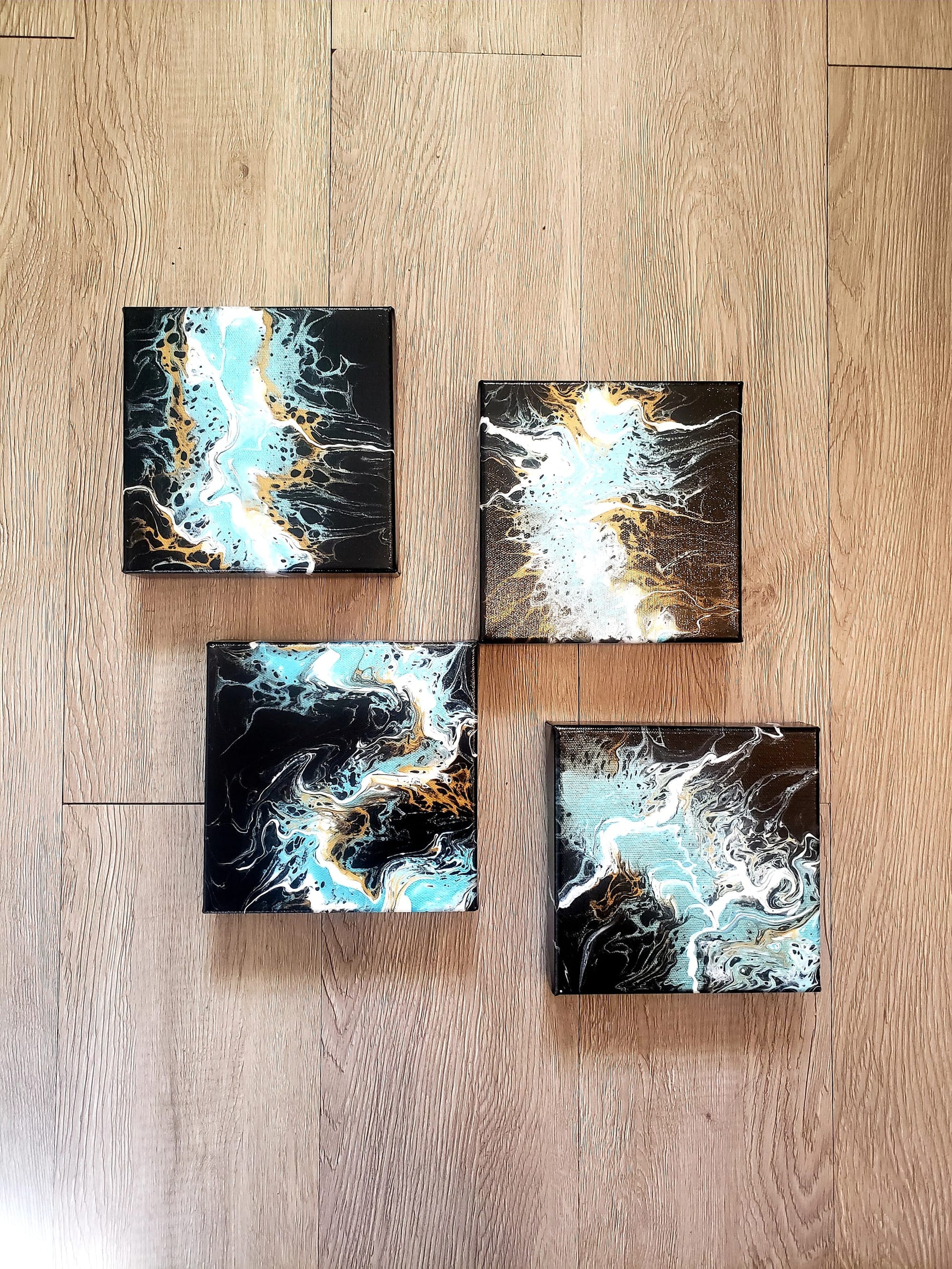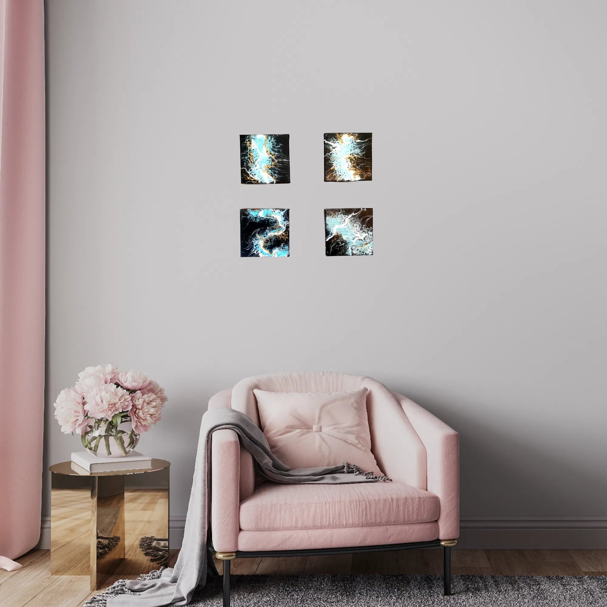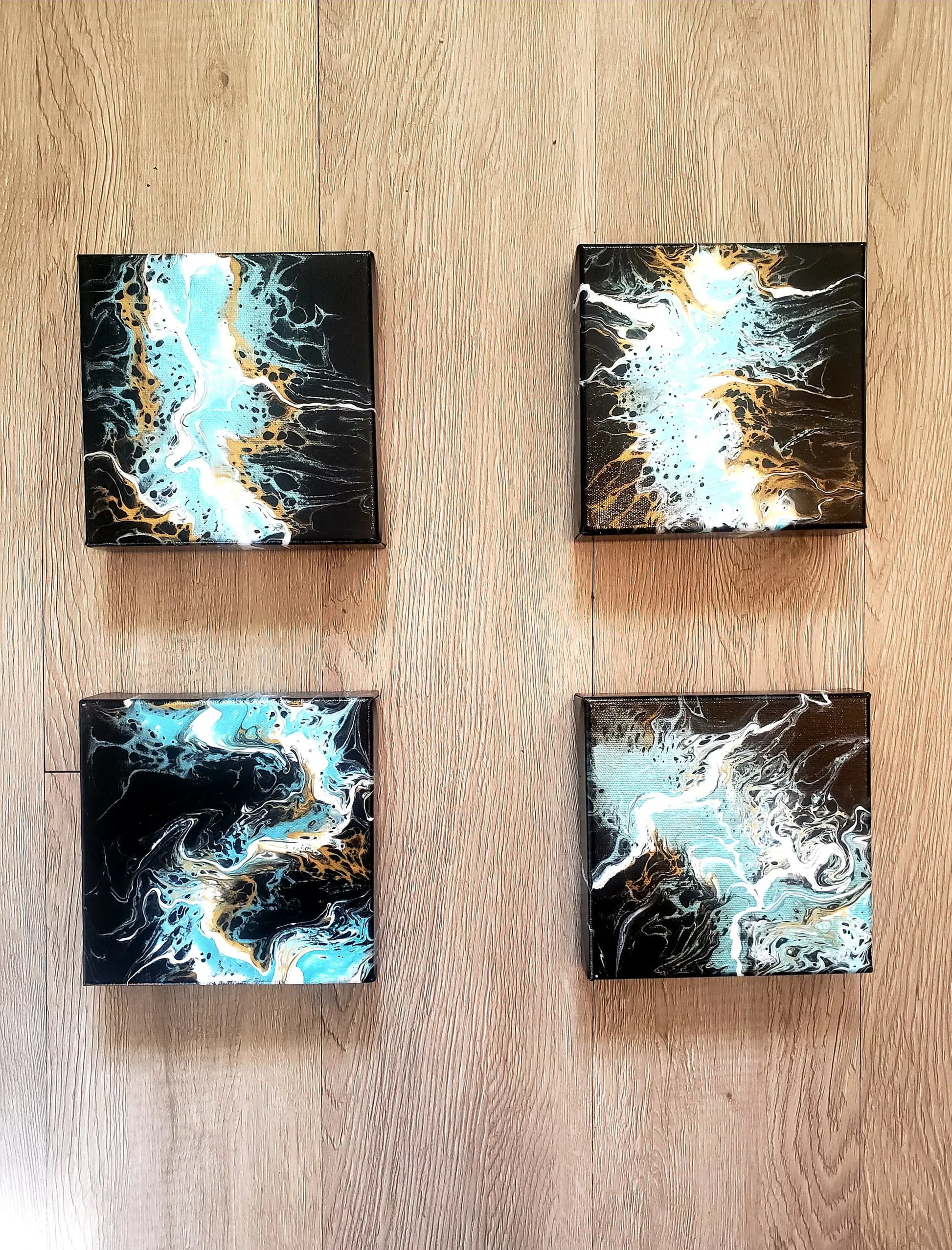 Fluid Art on a set of four gallery wrapped canvases. Created using a unique pouring technique that results in stunning and vibrant abstract designs. Hues of metallic gold, white and blue glide across the canvases that can give a sense of calm. Various ways to hang this beautiful set. Make a statement with this appealing and expressive form of Art, let this artwork become the focal point of any room. With high quality liquid semi-gloss varnish applied for protection, durability and appeal.