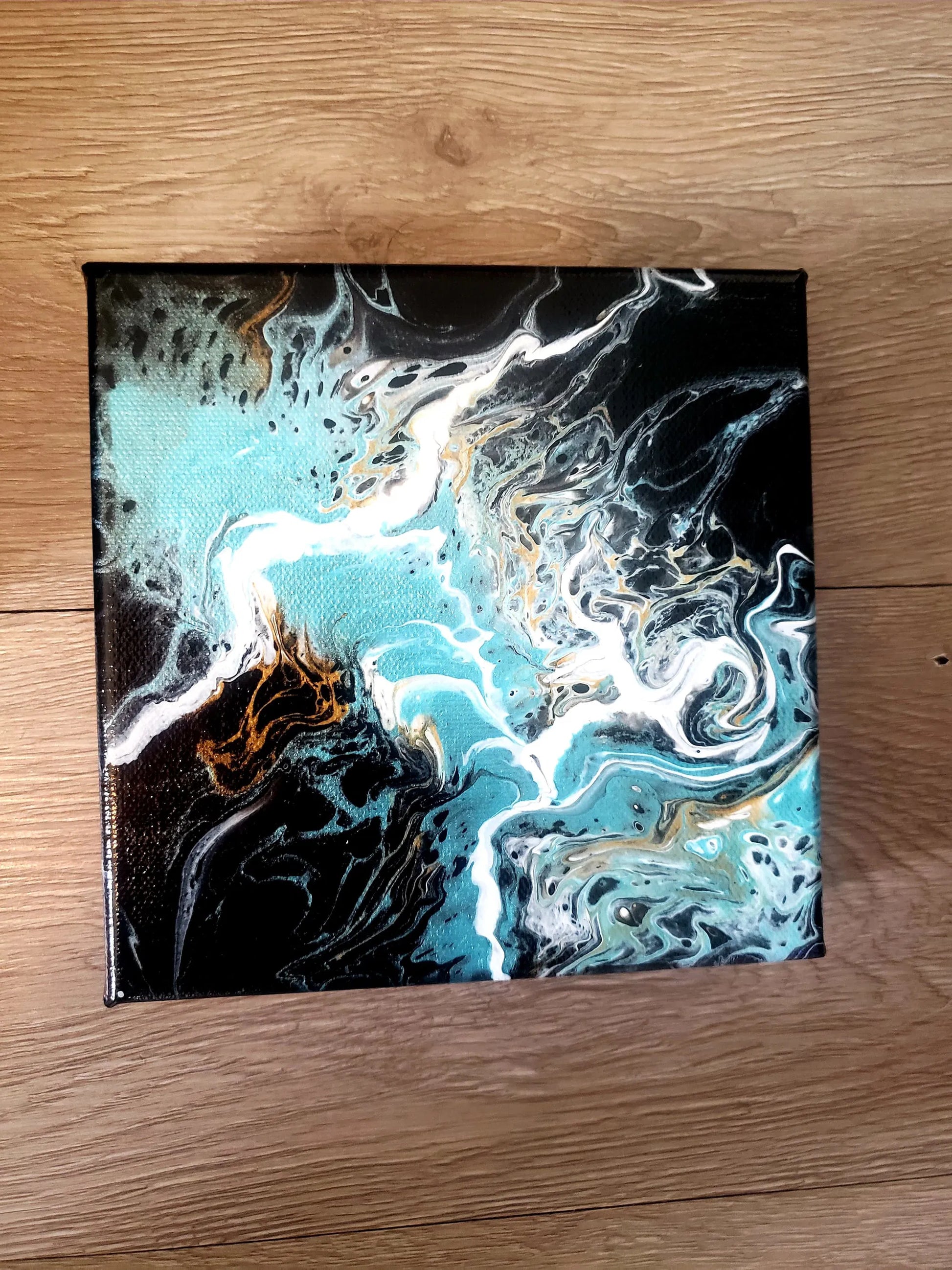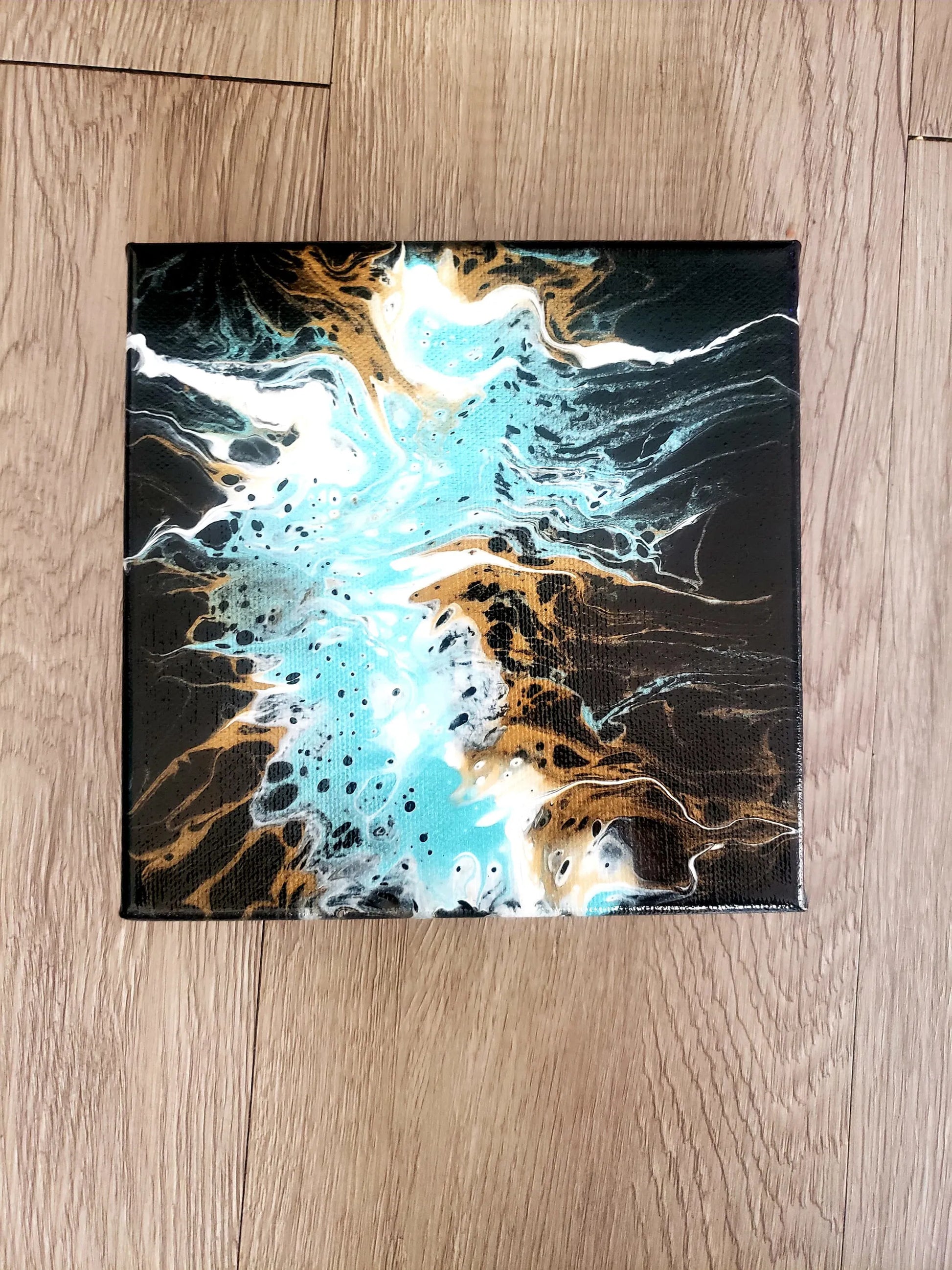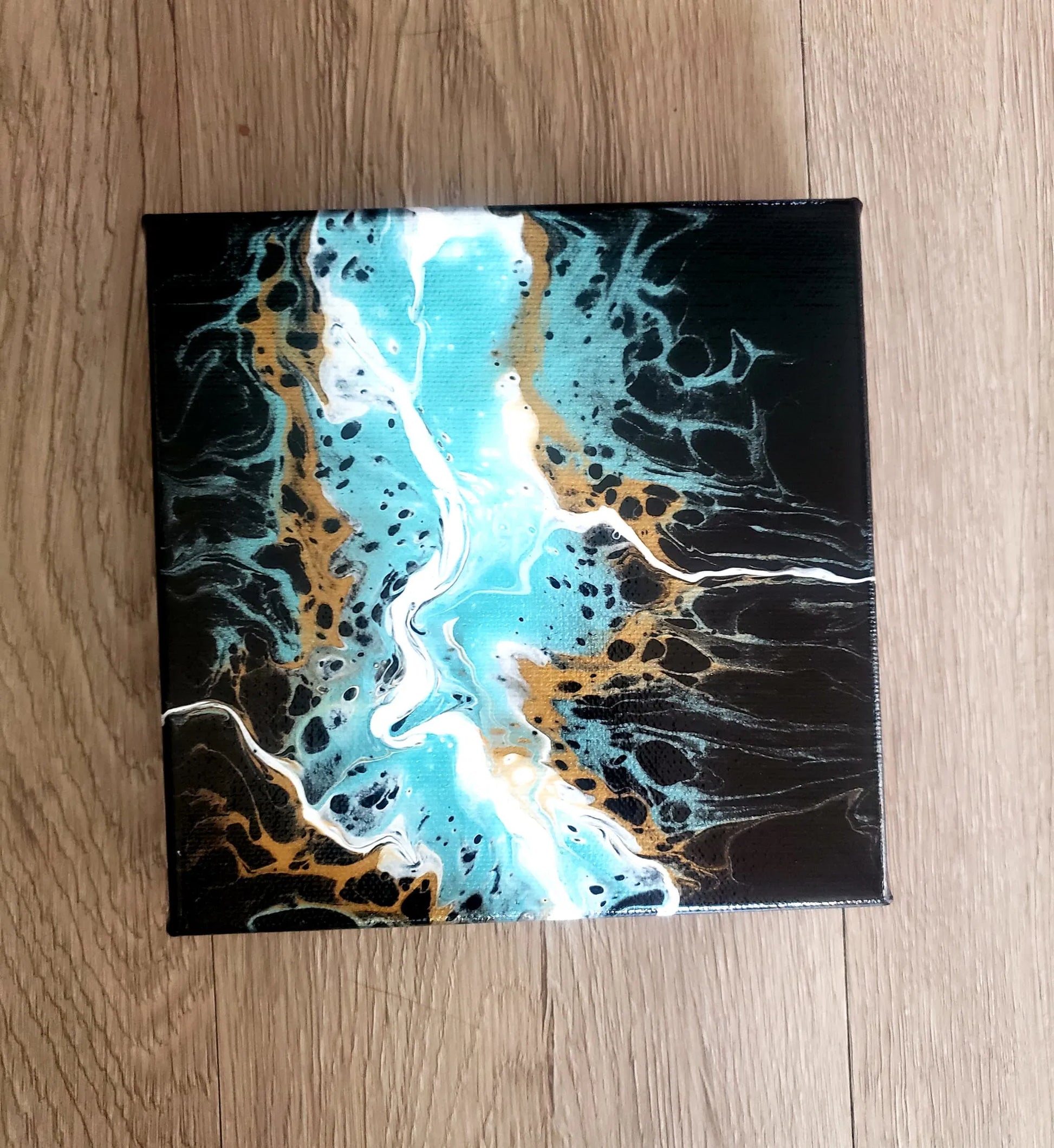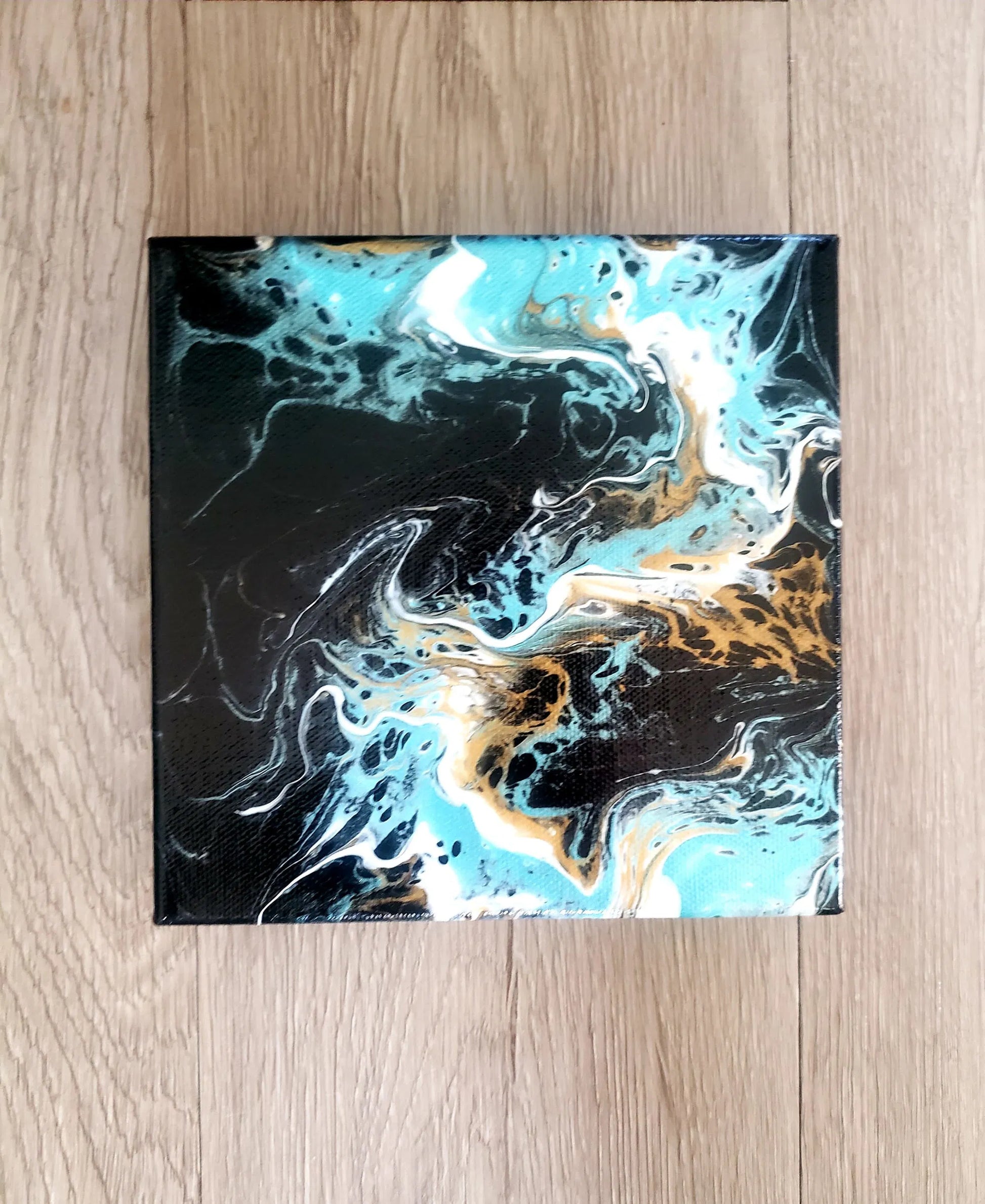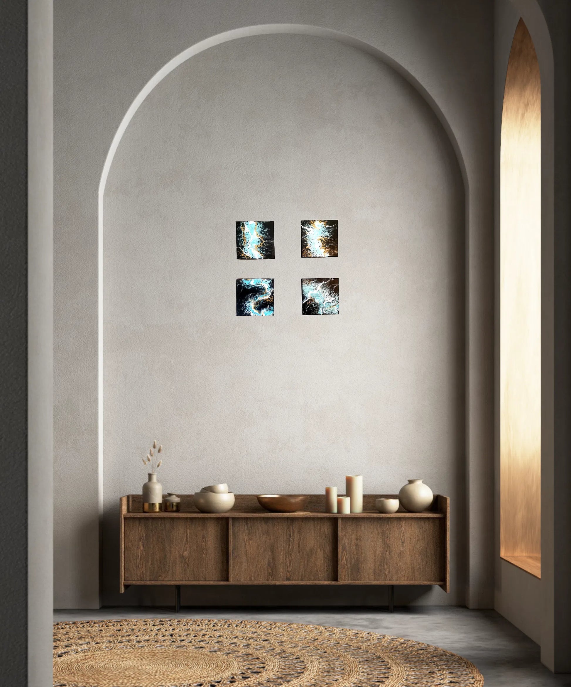 Fluid Art on a set of four gallery wrapped canvases. Created using a unique pouring technique that results in stunning and vibrant abstract designs. Hues of metallic gold, white and blue glide across the canvases that can give a sense of calm. Various ways to hang this beautiful set. Make a statement with this appealing and expressive form of Art, let this artwork become the focal point of any room. With high quality liquid semi-gloss varnish applied for protection, durability and appeal.