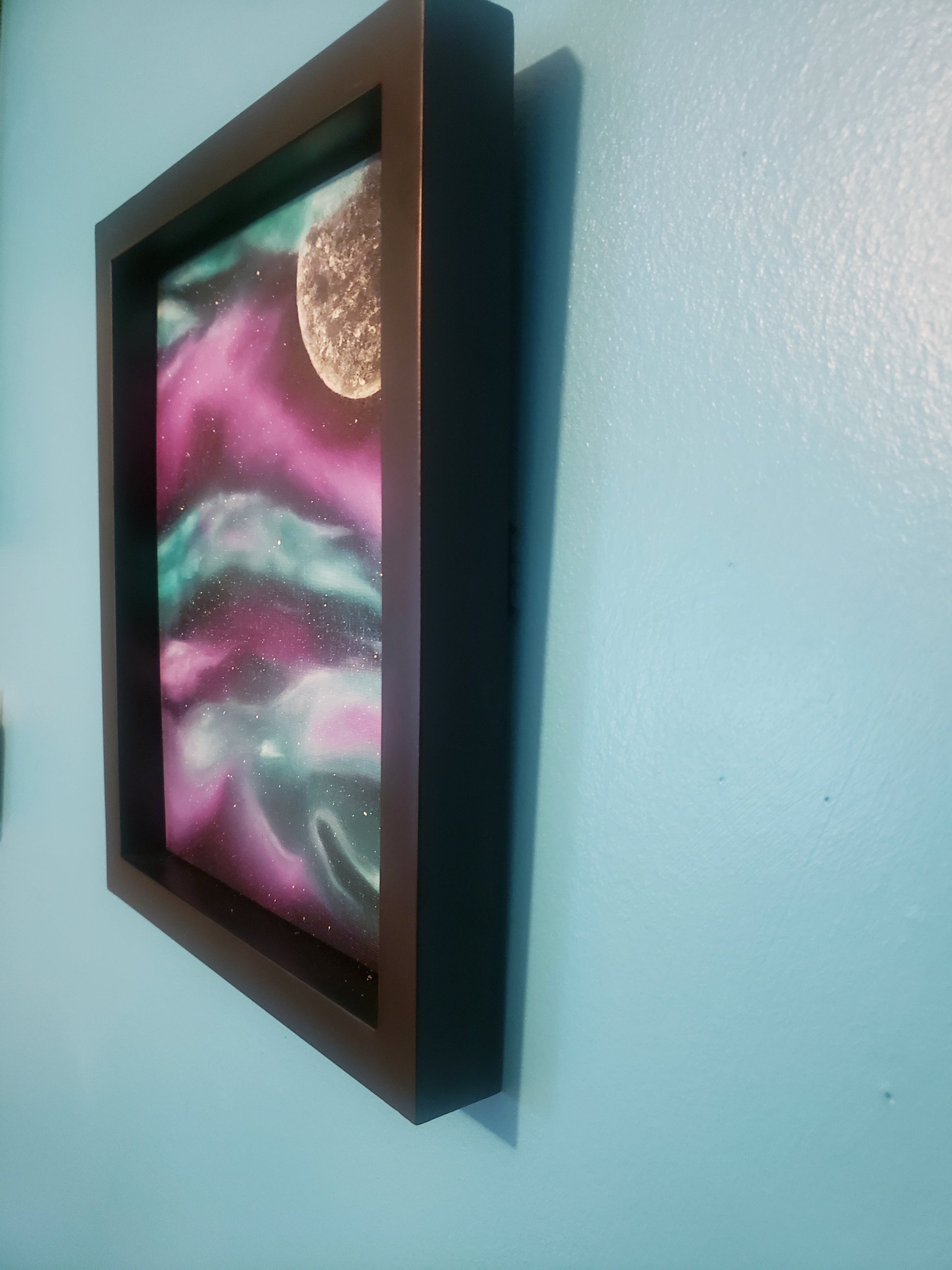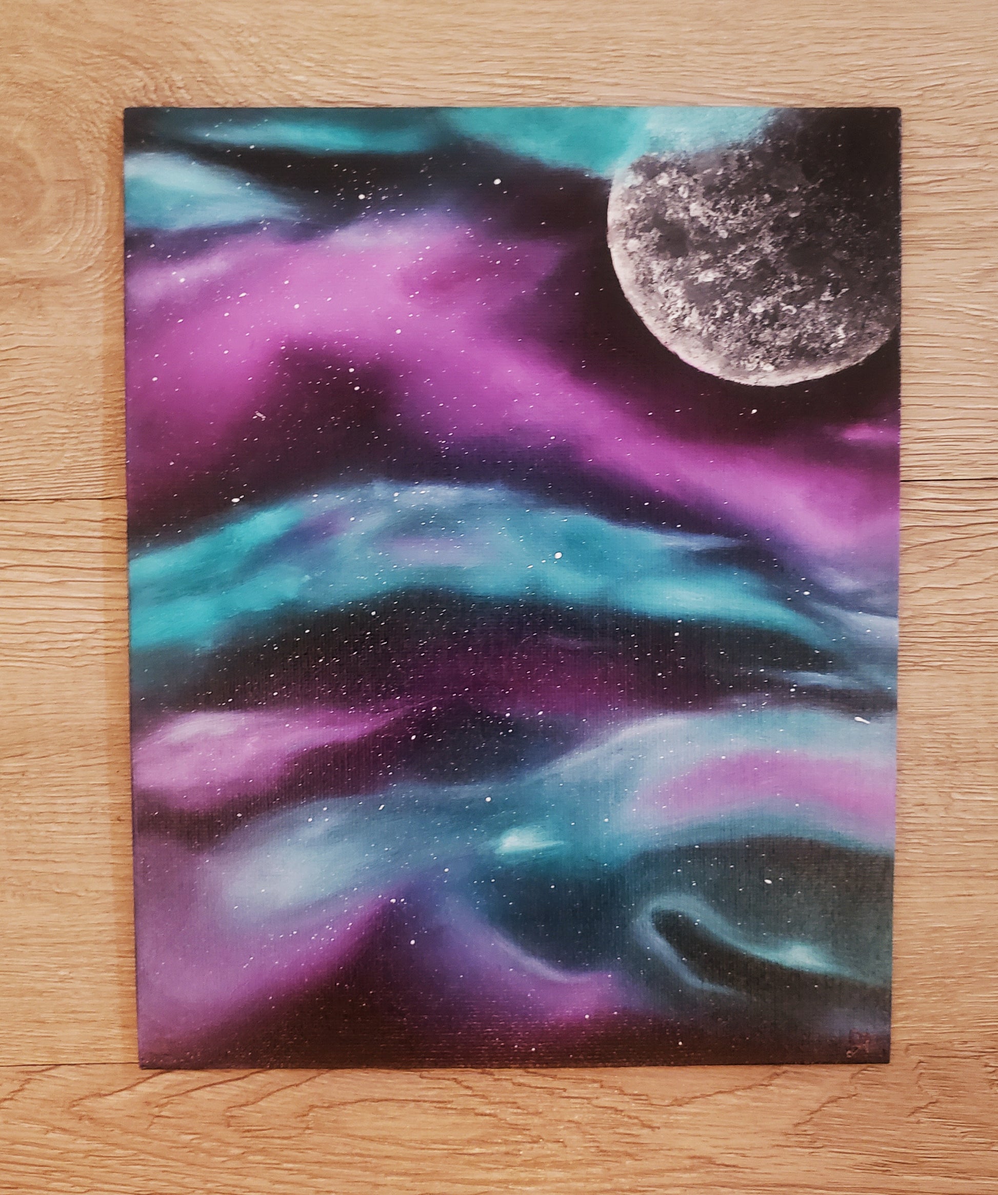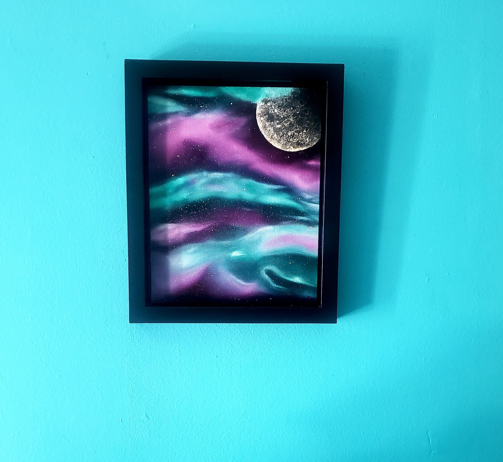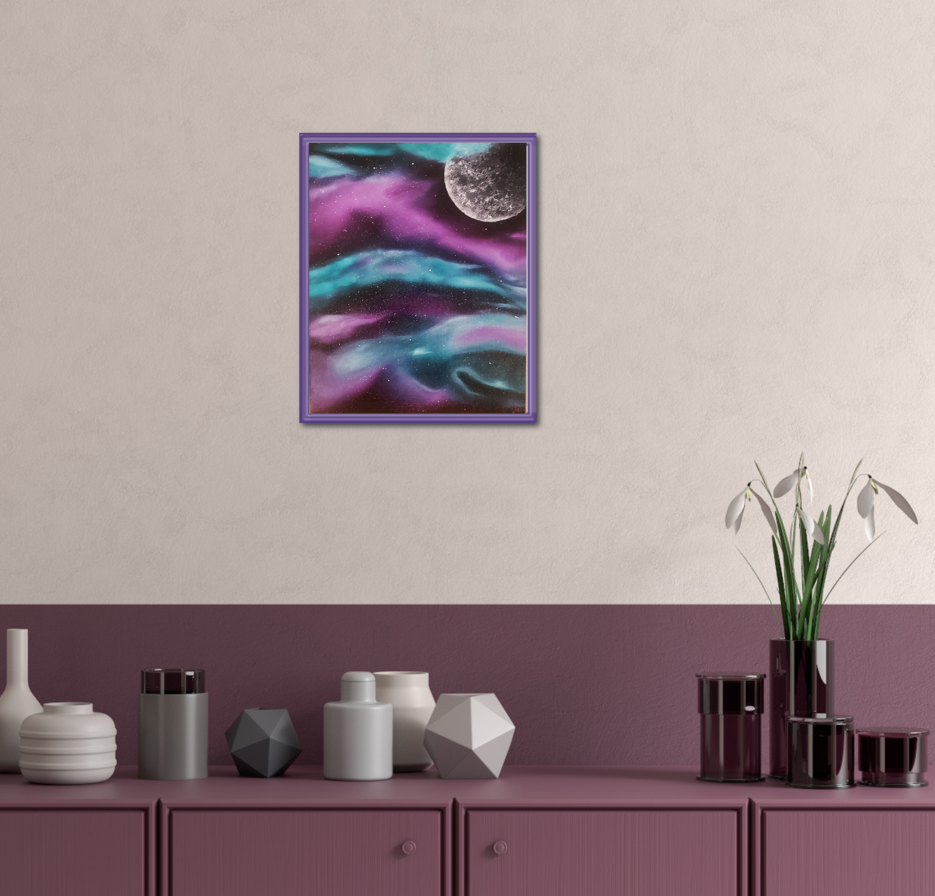 A space-themed oil painting on a canvas board. It captures the eye with a radiant detailed moon shimmering alongside celestial mist, with vivid hues of magenta and teal. Scattered stars twinkling gracefully creating a sense of tranquility. Hand-painted with premium oil paints, this artwork promises to transform any space into a captivating cosmic realm. A black frame is included.