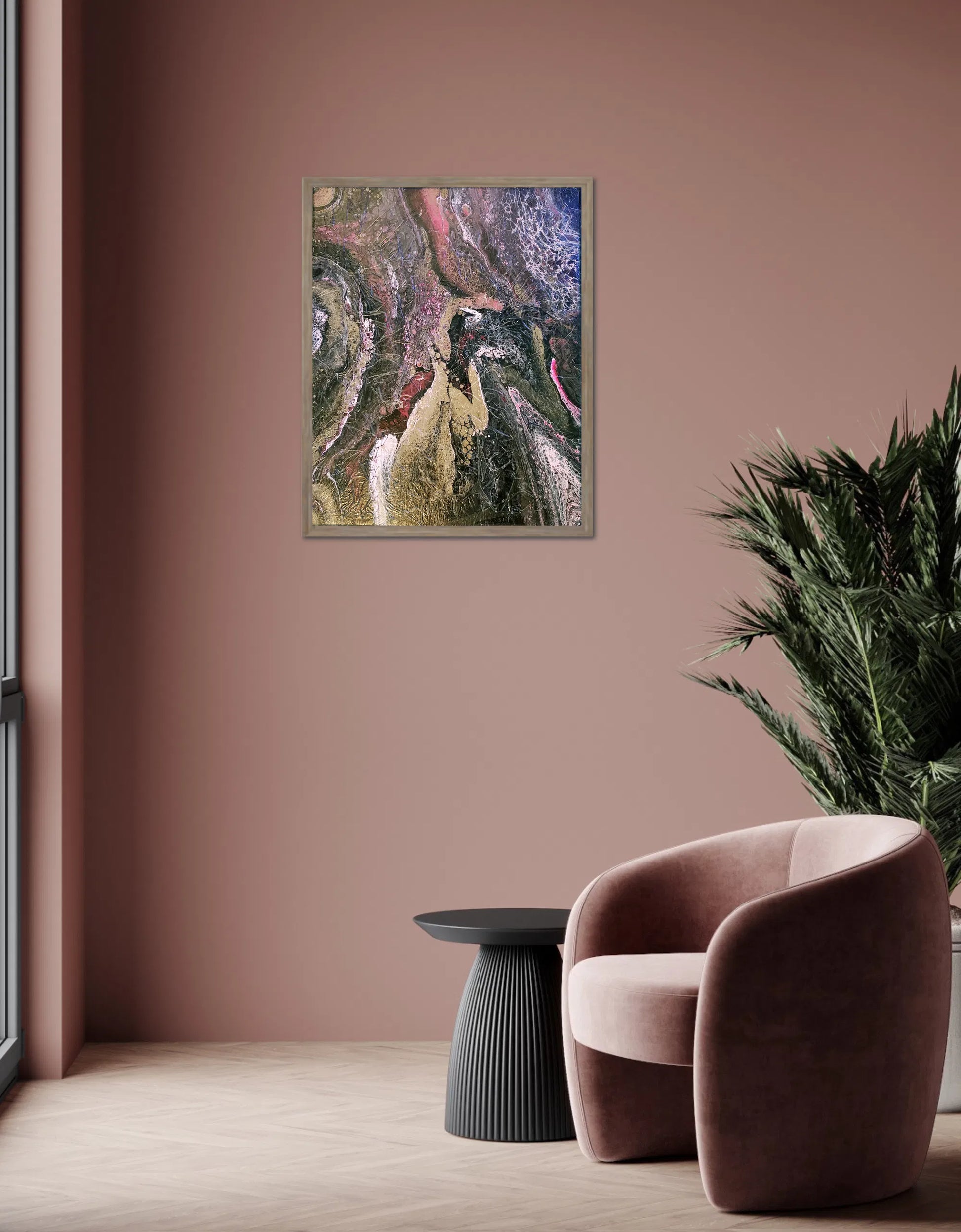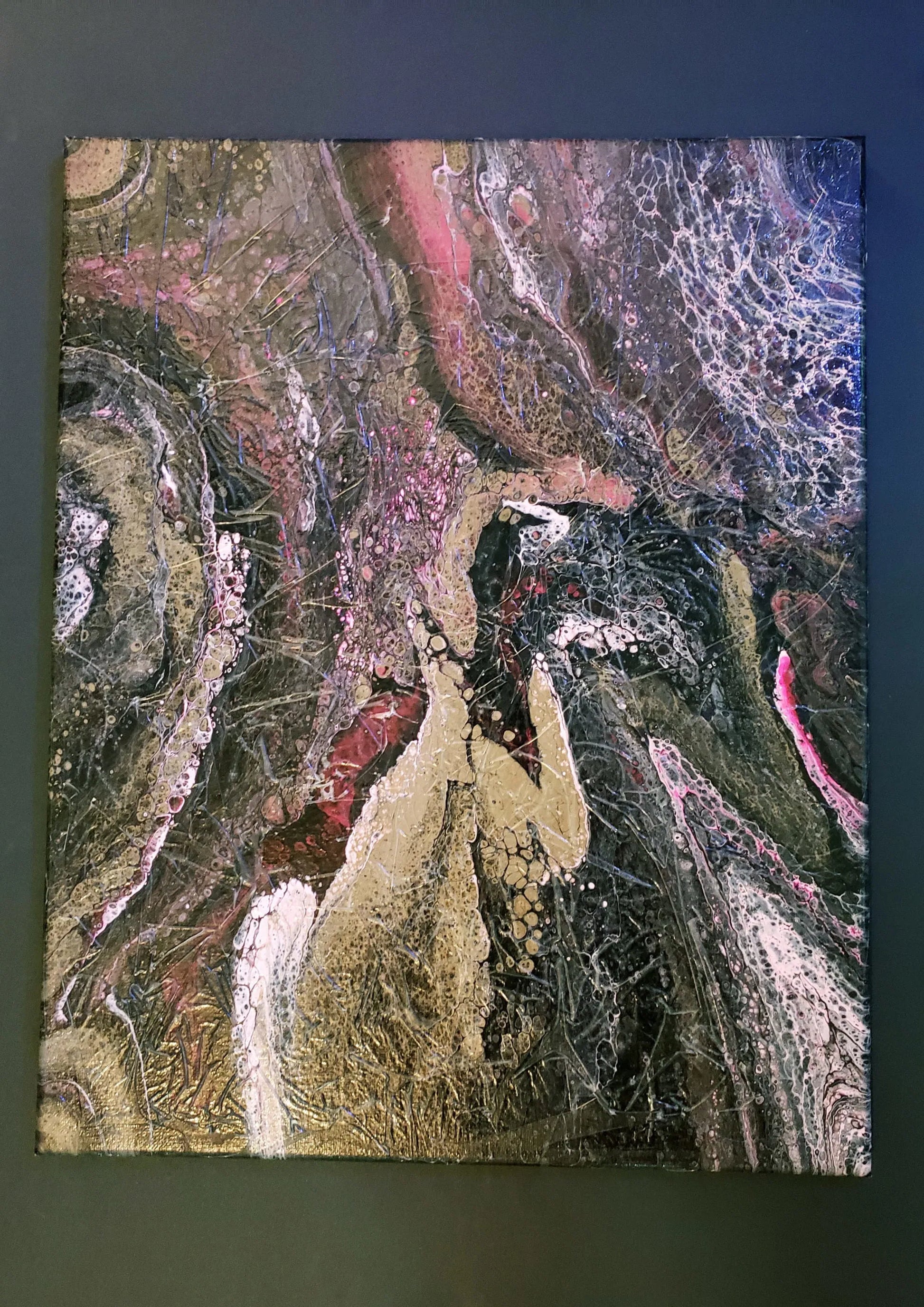 Add a touch of modern art to your space with this Acrylic Pour Painting. A unique display of colors, depth and fluid patterns created through the unique pouring technique with quality acrylic paints. A textured ice medium overlays this canvas for an intriguing added effect. Pinks, black, gold and other hues engulf this canvas. Make a statement with this dynamic and expressive form of Art. Spray varnish applied for protection and durability. Frame not included.