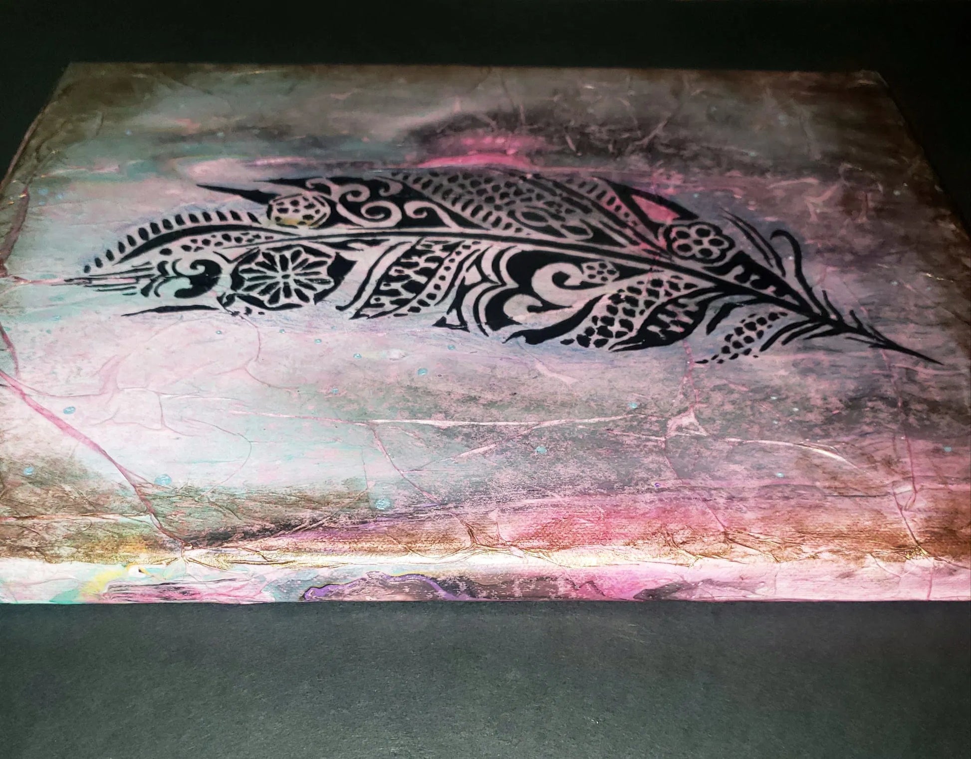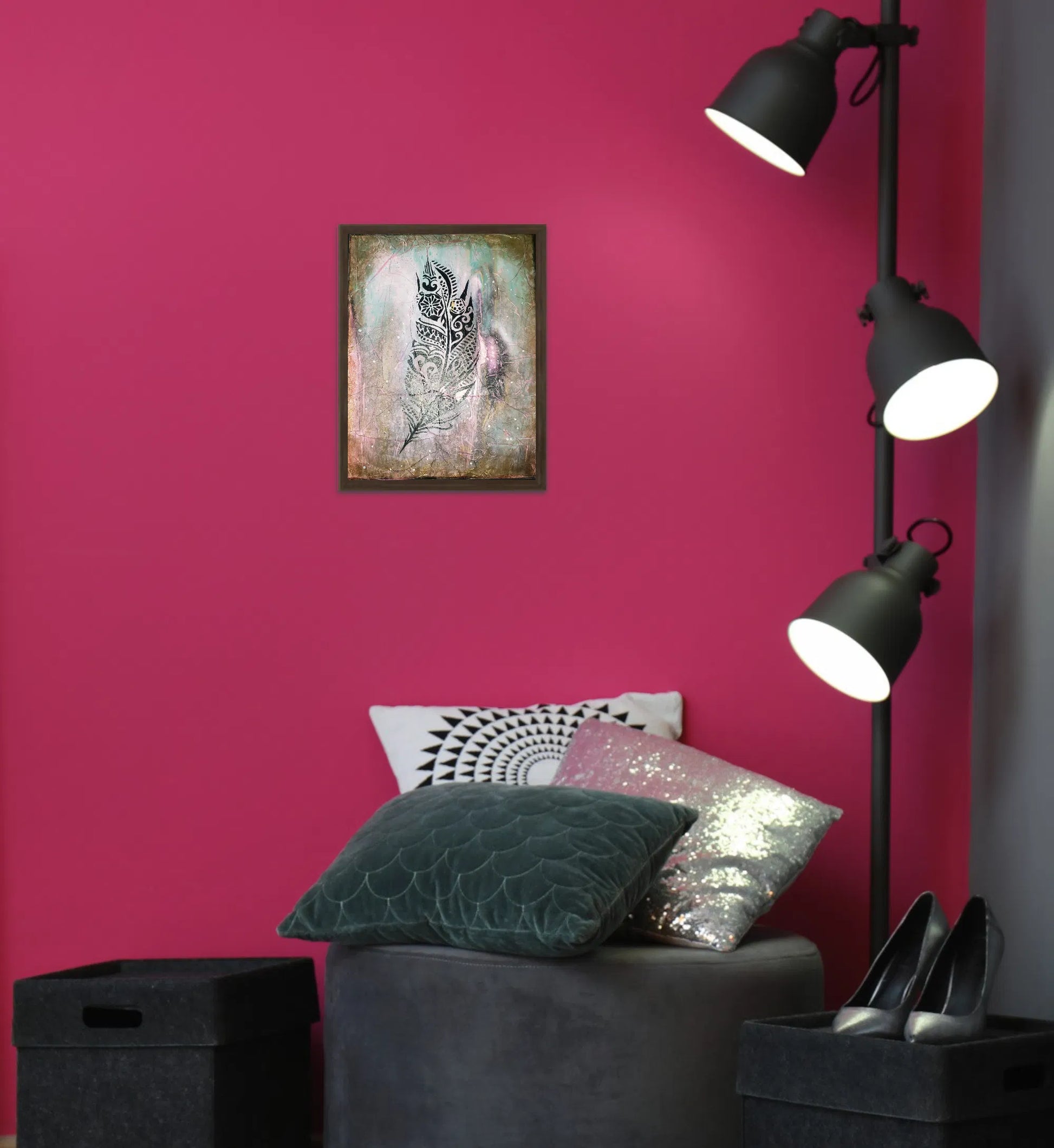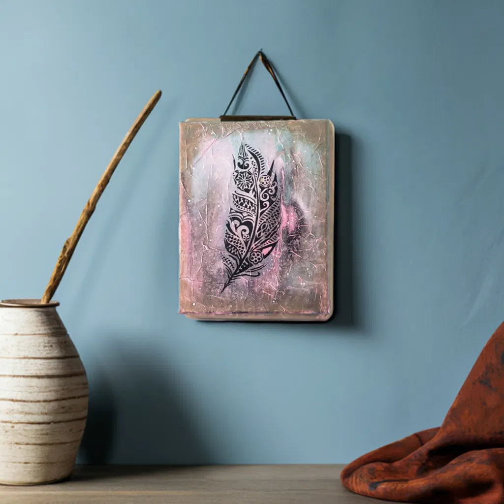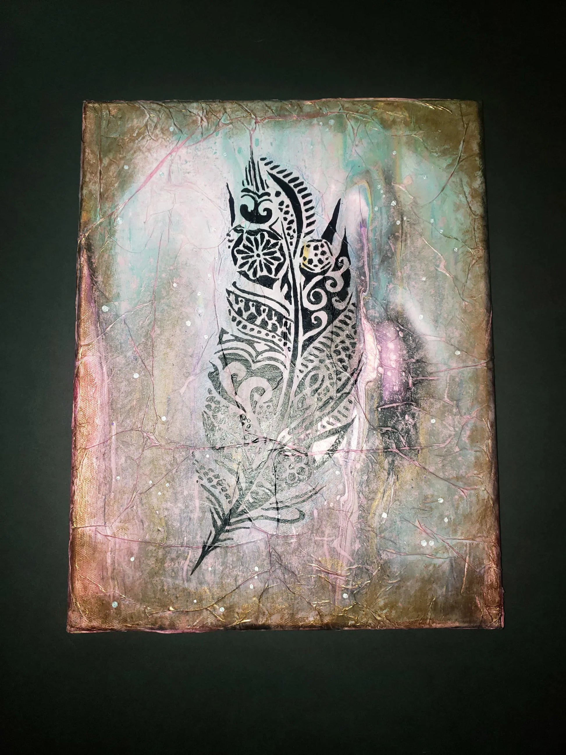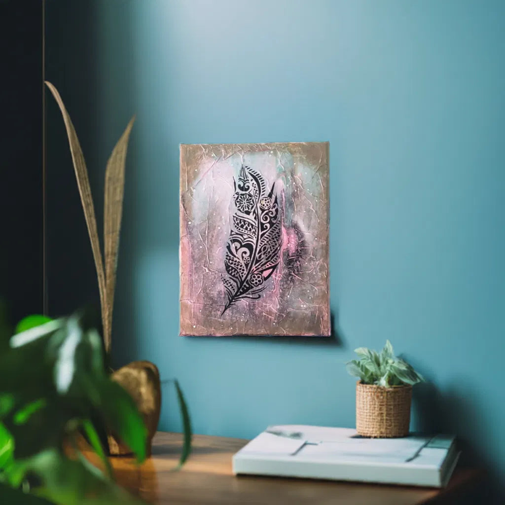 Come gaze at this patina inspired styled canvas Art. Light hues of blue and pink glide smoothly across and into each other in this piece. A hand painted black feather is centered in the canvas with boarders of metallic gold mica powder and baby blue metallic circles, giving it a beautiful, shimmered touch. Spray varnish applied for protection. Frame not included.