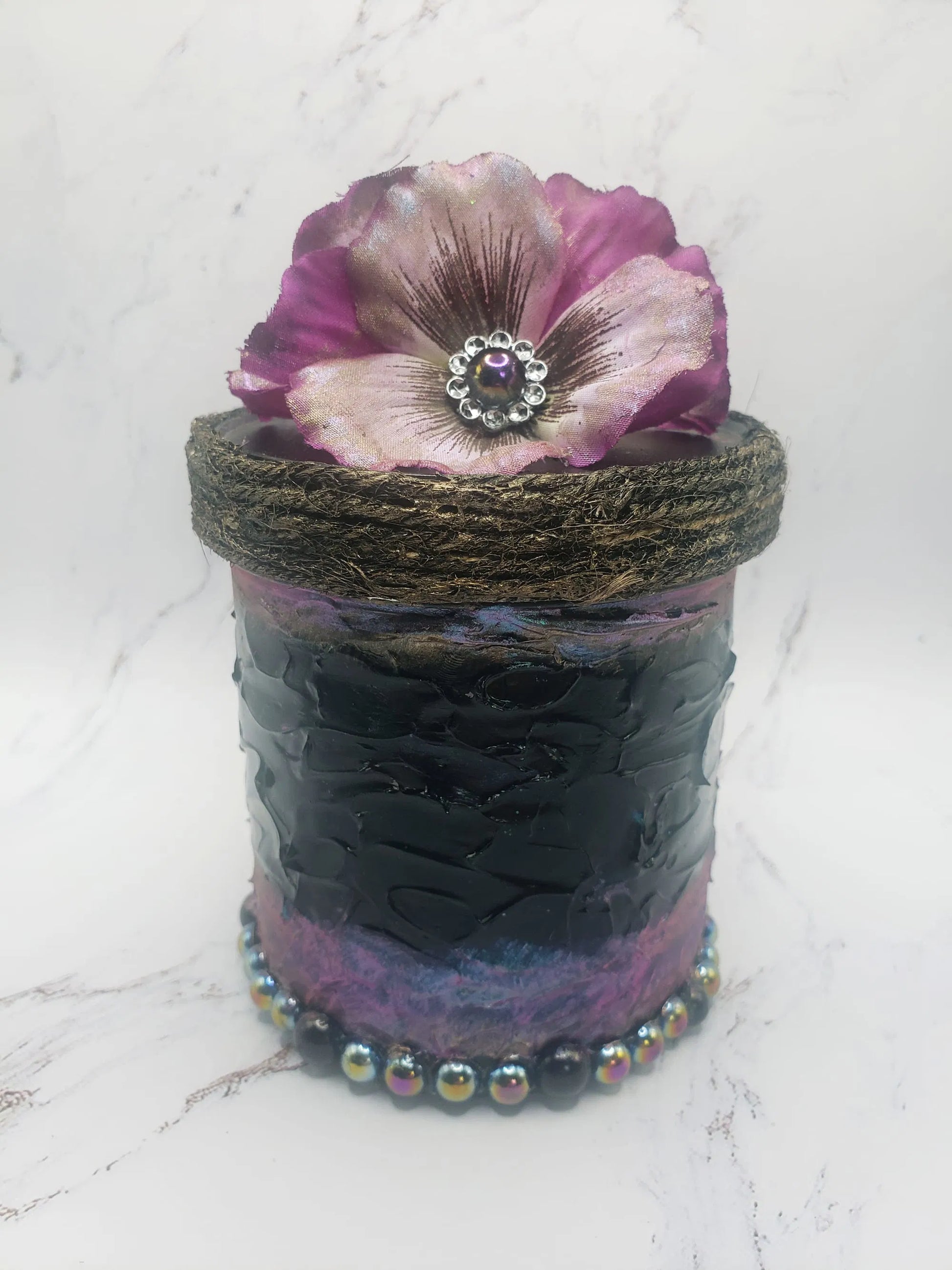 Three multi-colored flowers sit on top of this Trinket Jar, with mica shimmer at the base of its pedals (Chameleon). The body of the jar is gloss black and textured. Above and below the midpoint are amazing chameleon hues from purples, pinks, and blues. Chameleon and black jewel pearls surround the base of the Trinket Jar. Keep your small items safe and in one place with this beautiful Flower Trinket Jar. This Decorative Jar is varnished using a professional grade liquid gloss. Threads cannot be hand painted as it will not adhere due to the twisting of the lid, as with any threads for painting repurposed products. Inside as pictures show is painted black to match the exterior as well as the interior of the lid.