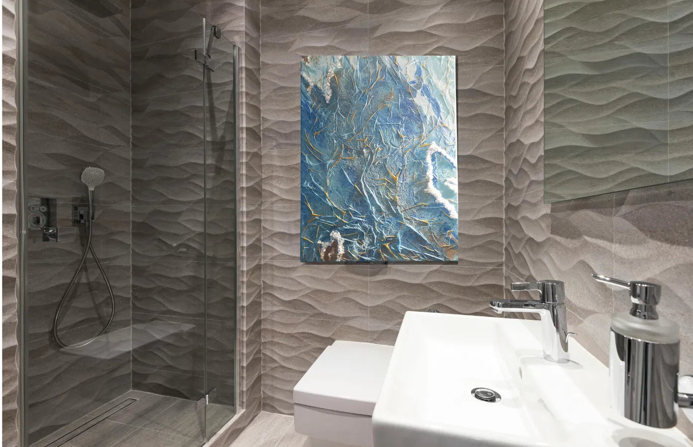 Use your senses and graze your fingers across this canvas, the texture alone creates a uniquely fascinating appeal to the touch as well as to the eye. Metallic gold accent lines strike across this piece overlaying sections of blue hues with an underlay of acrylic flow technique. Also incorporated in this Art piece are Geode glass-like accents encompassing around three specific sections. Depending on the angle the eye catches this piece, little shimmer dots emerge for an added effect. Spray varnish applied for protection, durability and appeal.