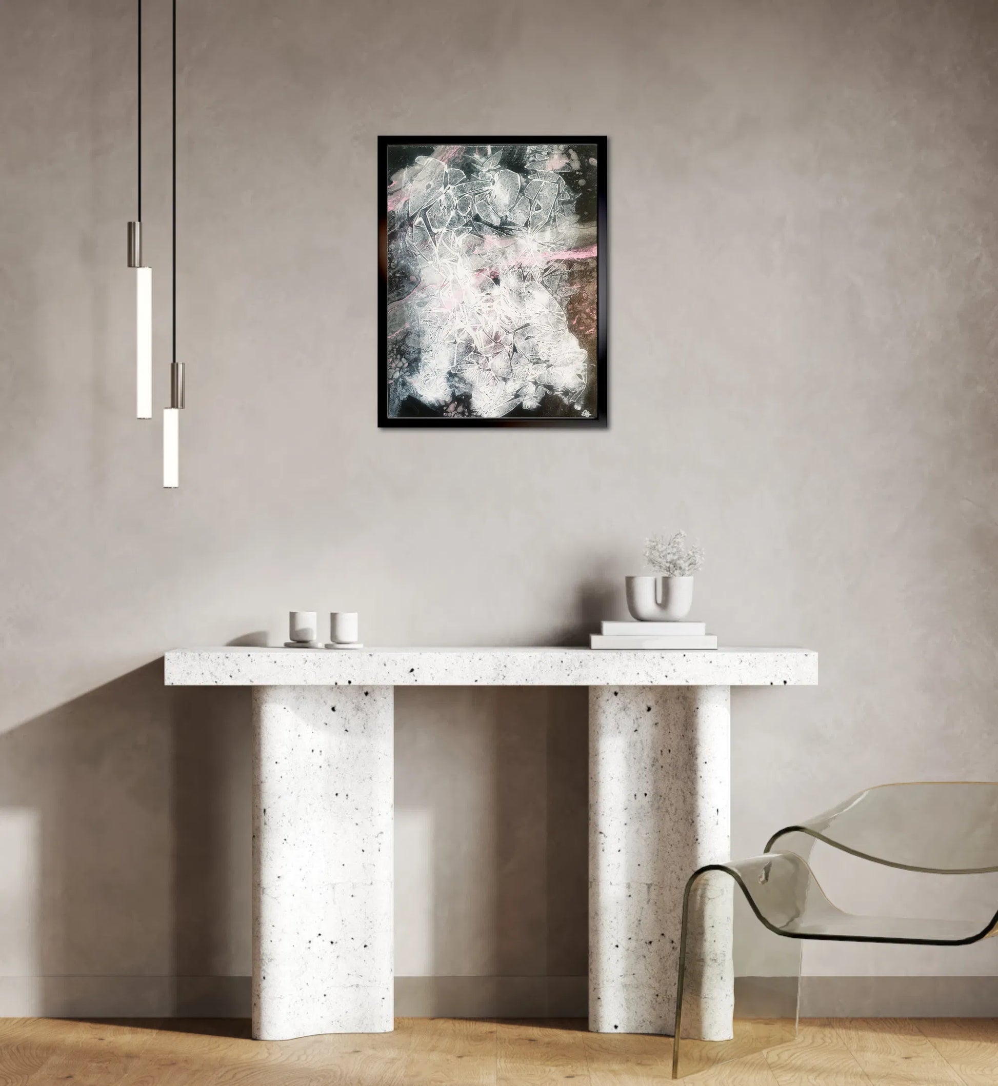 Add a touch of modern art to your space with this Acrylic Pour Painting with an ice effect overlay. An appealing display of colors, depth, dimension and fluid patterns created through the unique pouring technique with quality acrylic paints. The combination of rich hues, and ice pedals flowing across the canvas, creates a dynamic, unique and visually captivating piece that will make a statement in any room. Hang it in your living room, bedroom, or office, and let this artwork become the focal point of your space. Semi-gloss Spray Varnish for protection and durability. Frame not included.