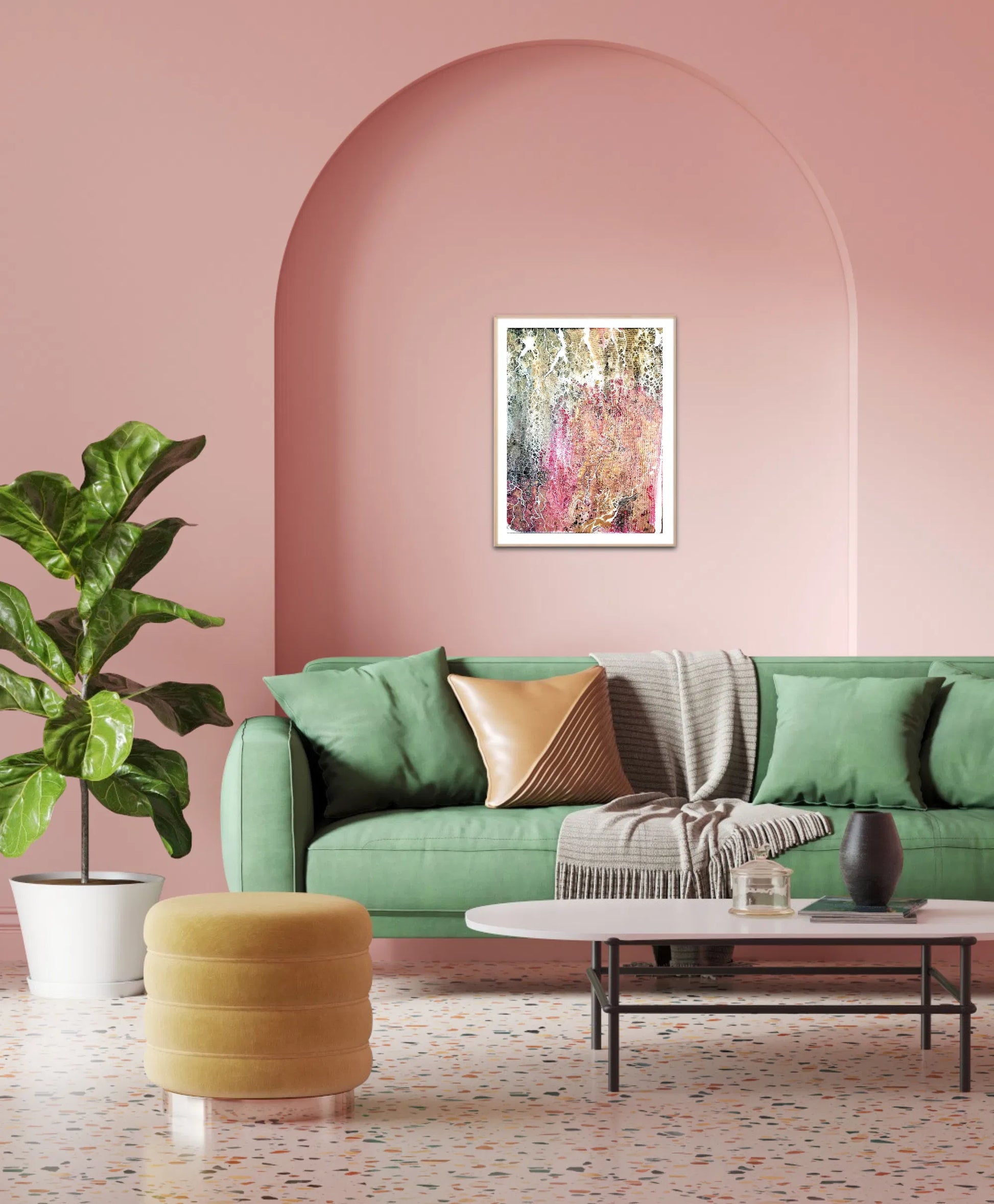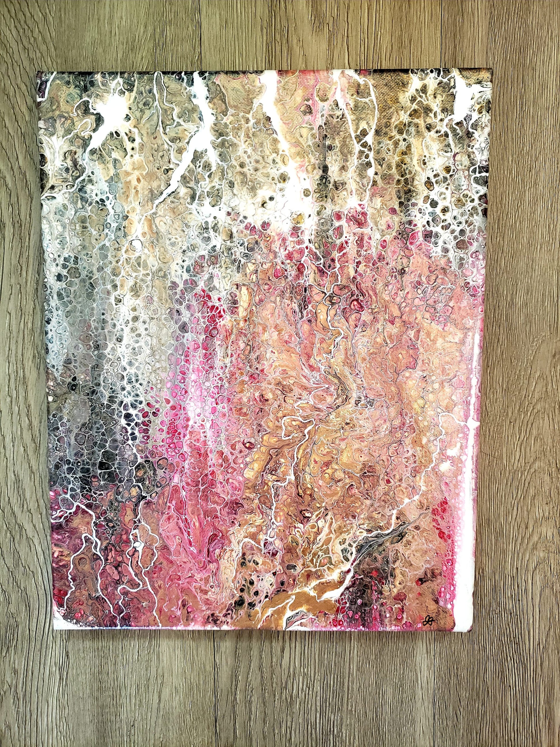 Come gaze at this interesting Acrylic Pour Painting, created using a special pouring technique that results in stunning and vibrant designs. How many strikes of lightning do you see? Hues of pinks, white, rand rose gold flow through this piece and the cells. Make a statement with this colorful piece of Art. High quality liquid satin varnish applied for protection and durability and appeal. Frame not included.