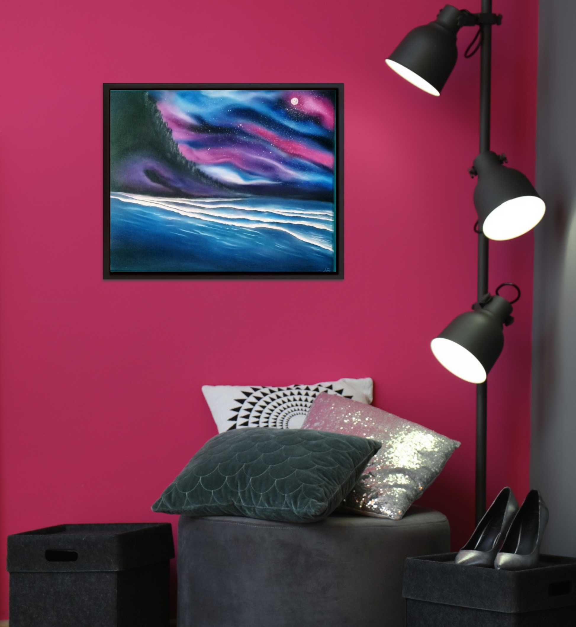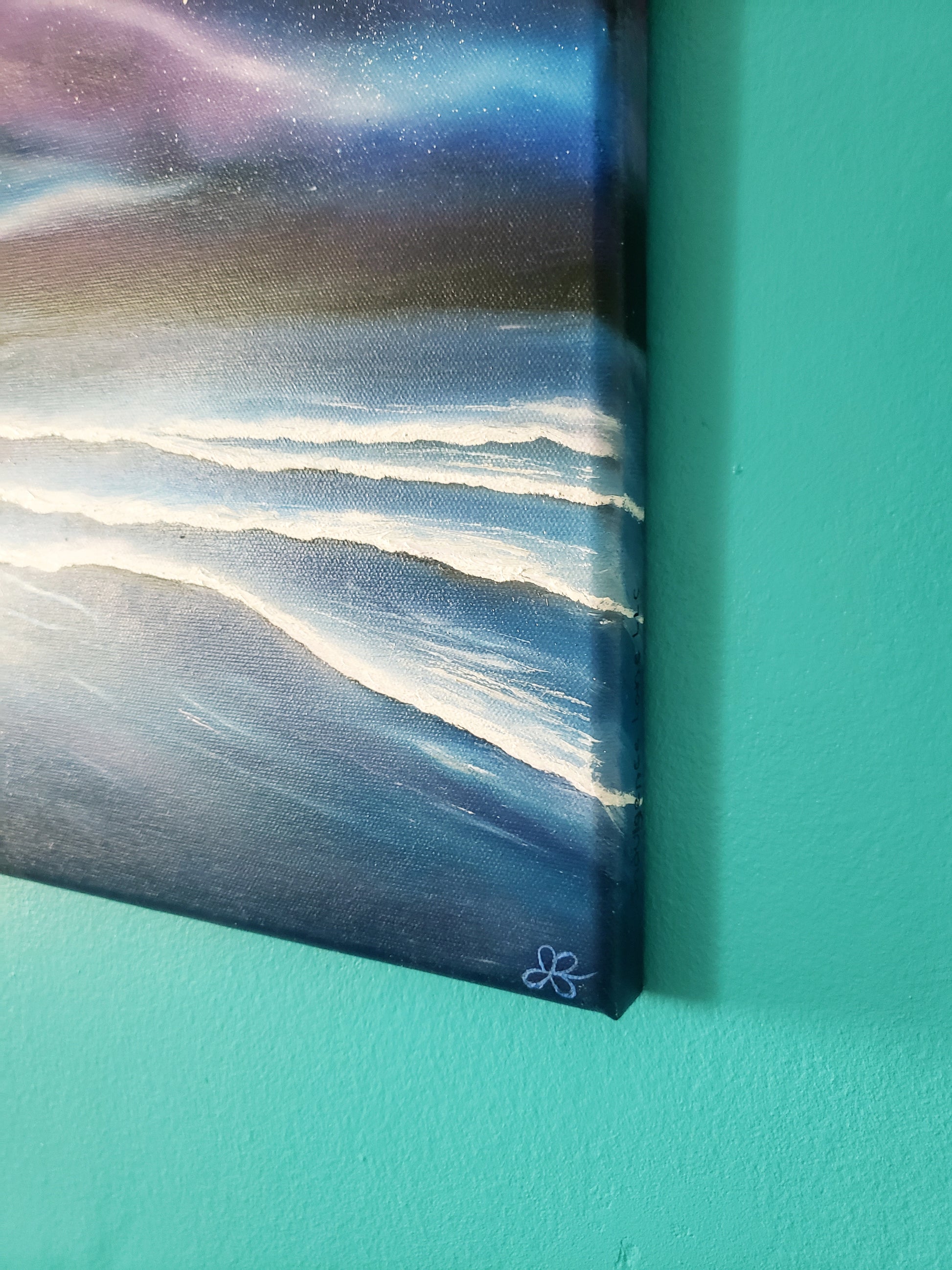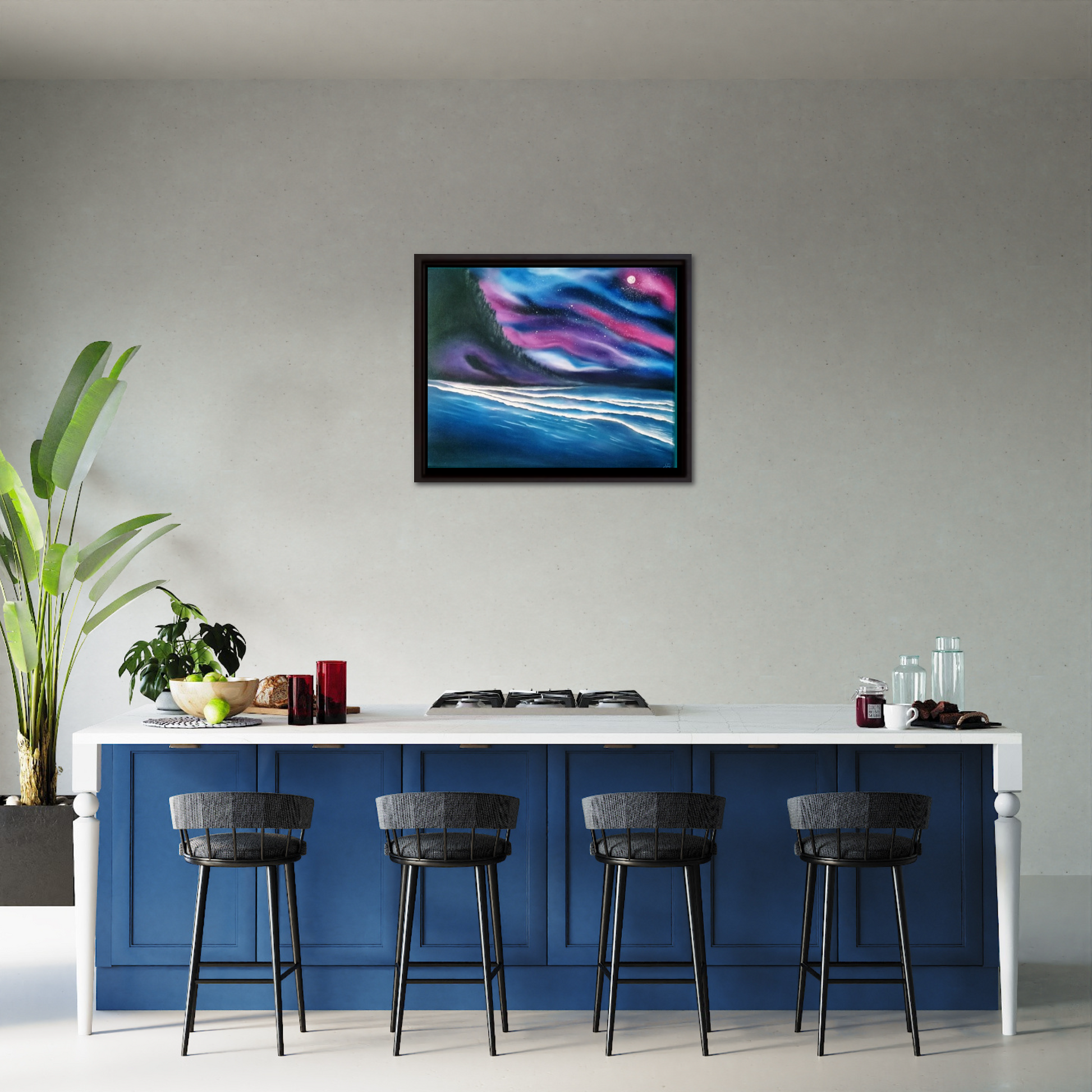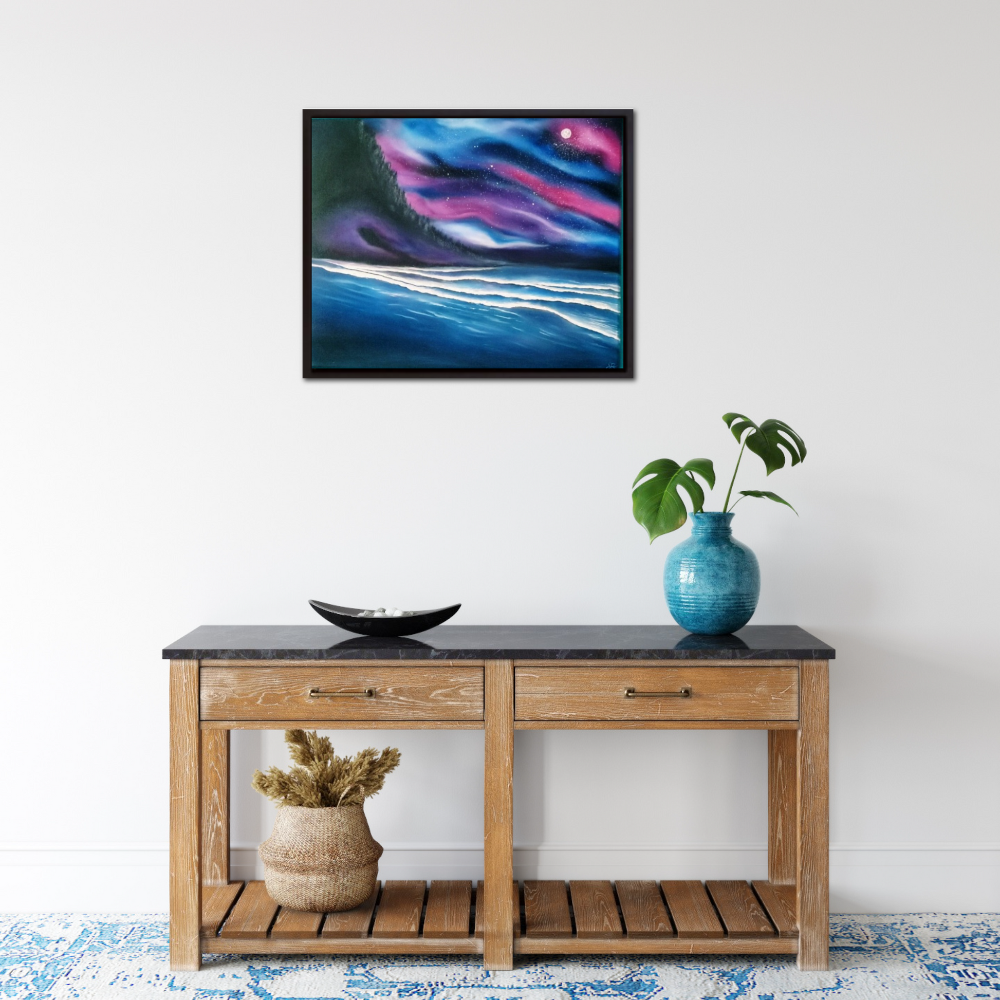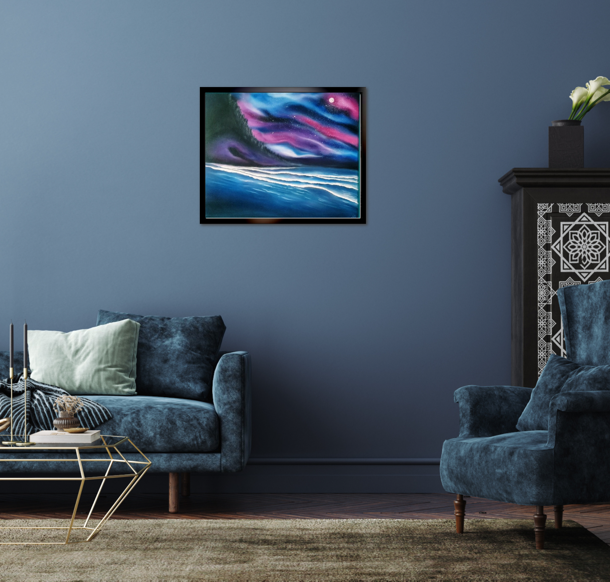 Oil Painting on a stretched canvas. Radiant clouds with vivid hues dance across the sky while the sound of small waves gently crashing onto the shore can almost be heard. In the more distant background lies a large mysterious mountain with a cave archway, what lies in the dark? Selective placement of stars are incorporated gracefully in the night sky. Hand-painted with high-quality oil paints, this intriguing painting brings a touch of mystery and beauty to your space. Frame not included.