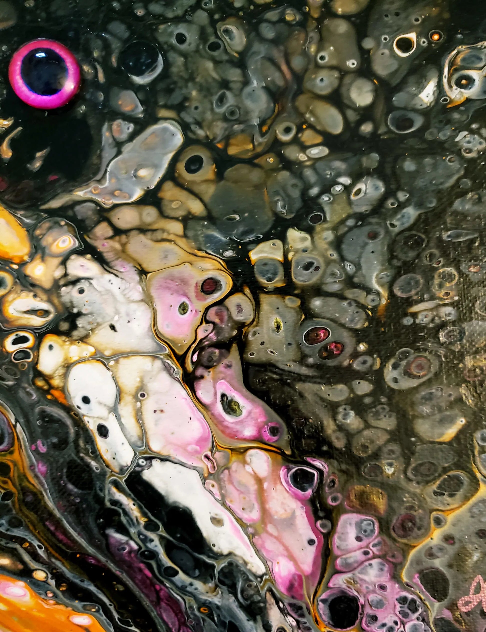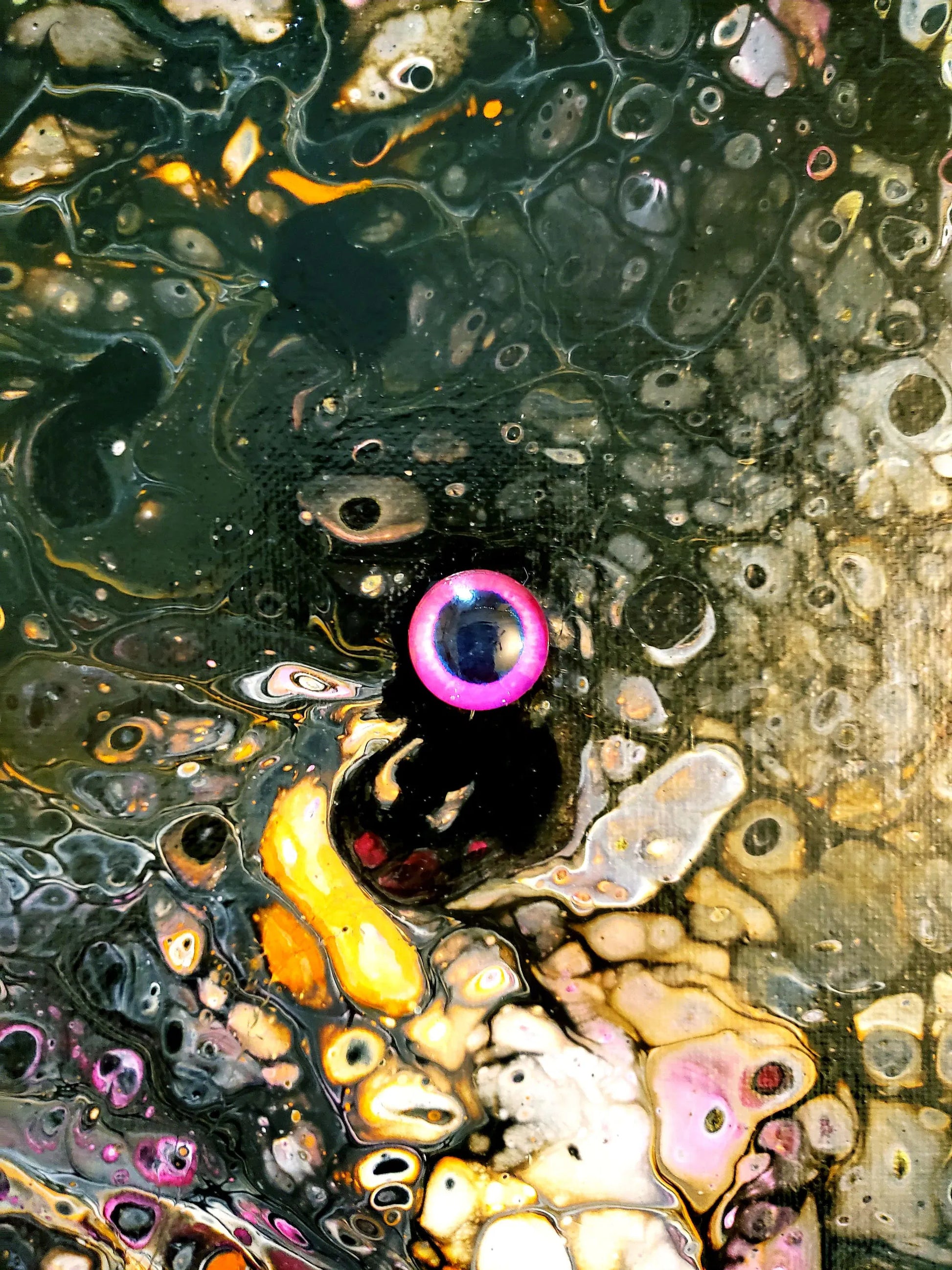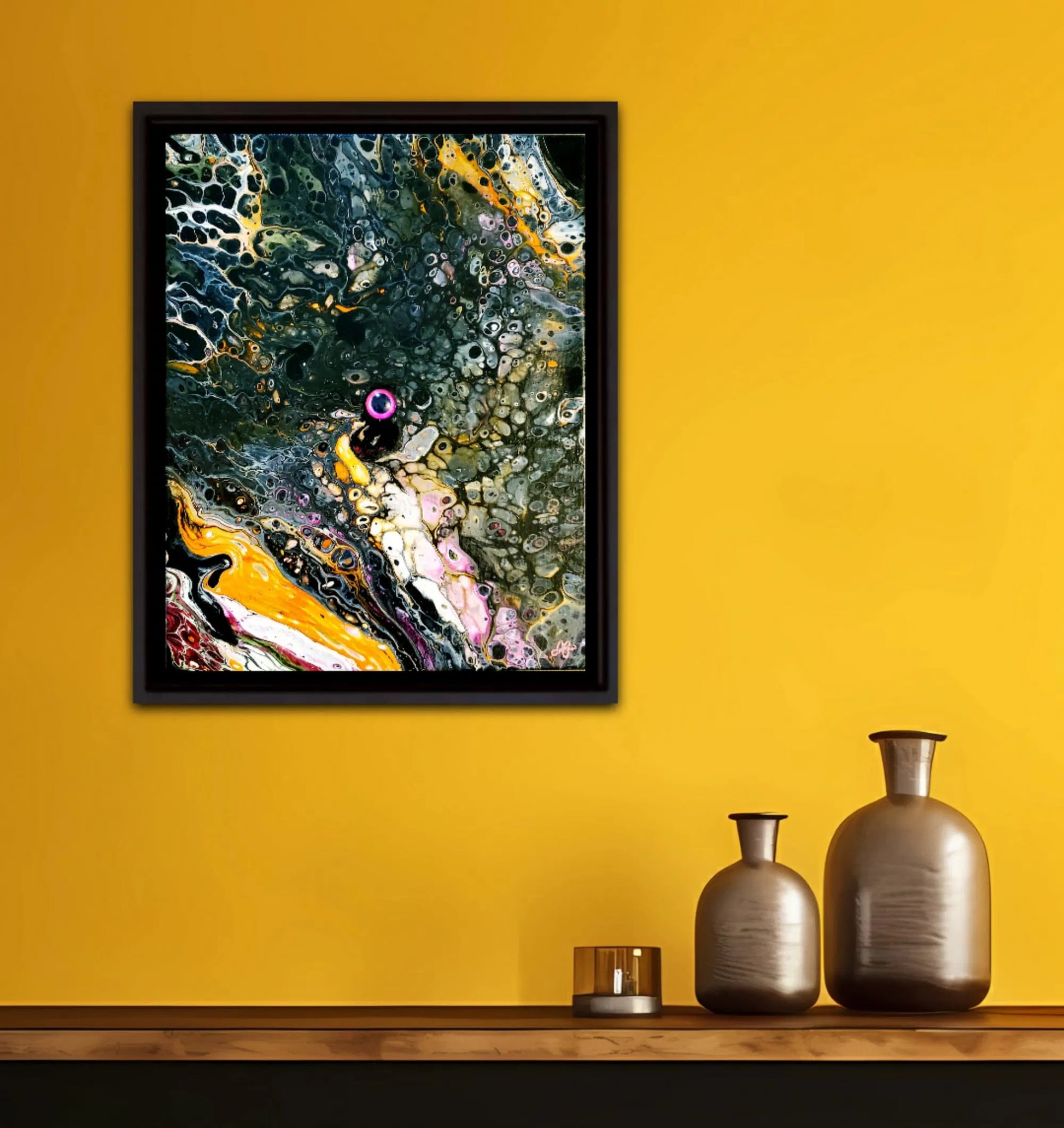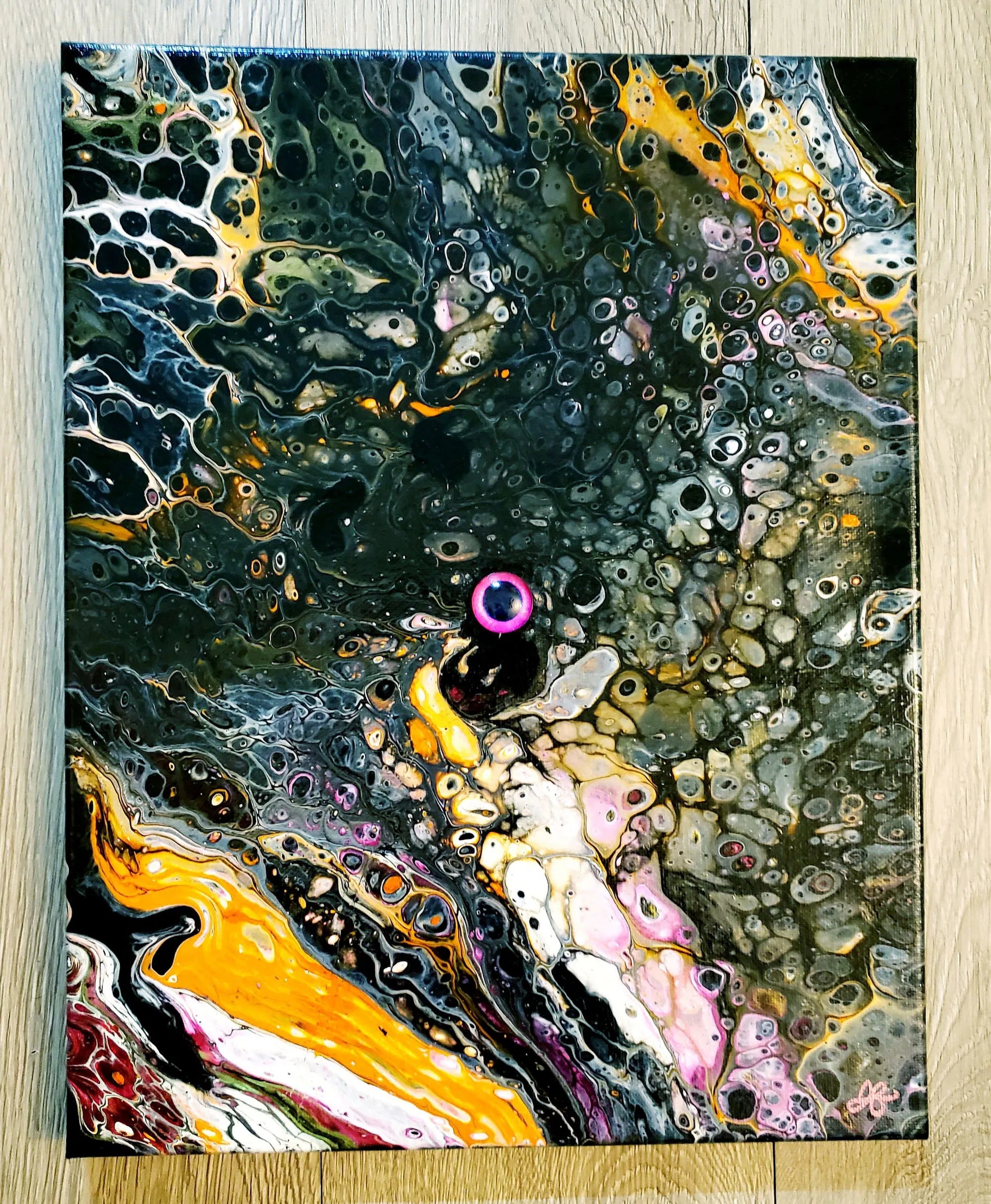 Add a touch of contemporary Art to your space with this Acrylic Pour Painting. A unique display of colors, depth and fluid patterns created through the unique pouring technique with quality acrylic paints. An intriguing, embellished center is incorporated in this piece for an added effect. Pinks, black, orange and other hues engulf this canvas. Make a statement with this expressive form of Art. Liquid gloss varnish applied for protection, durability and appeal. Frame not included.