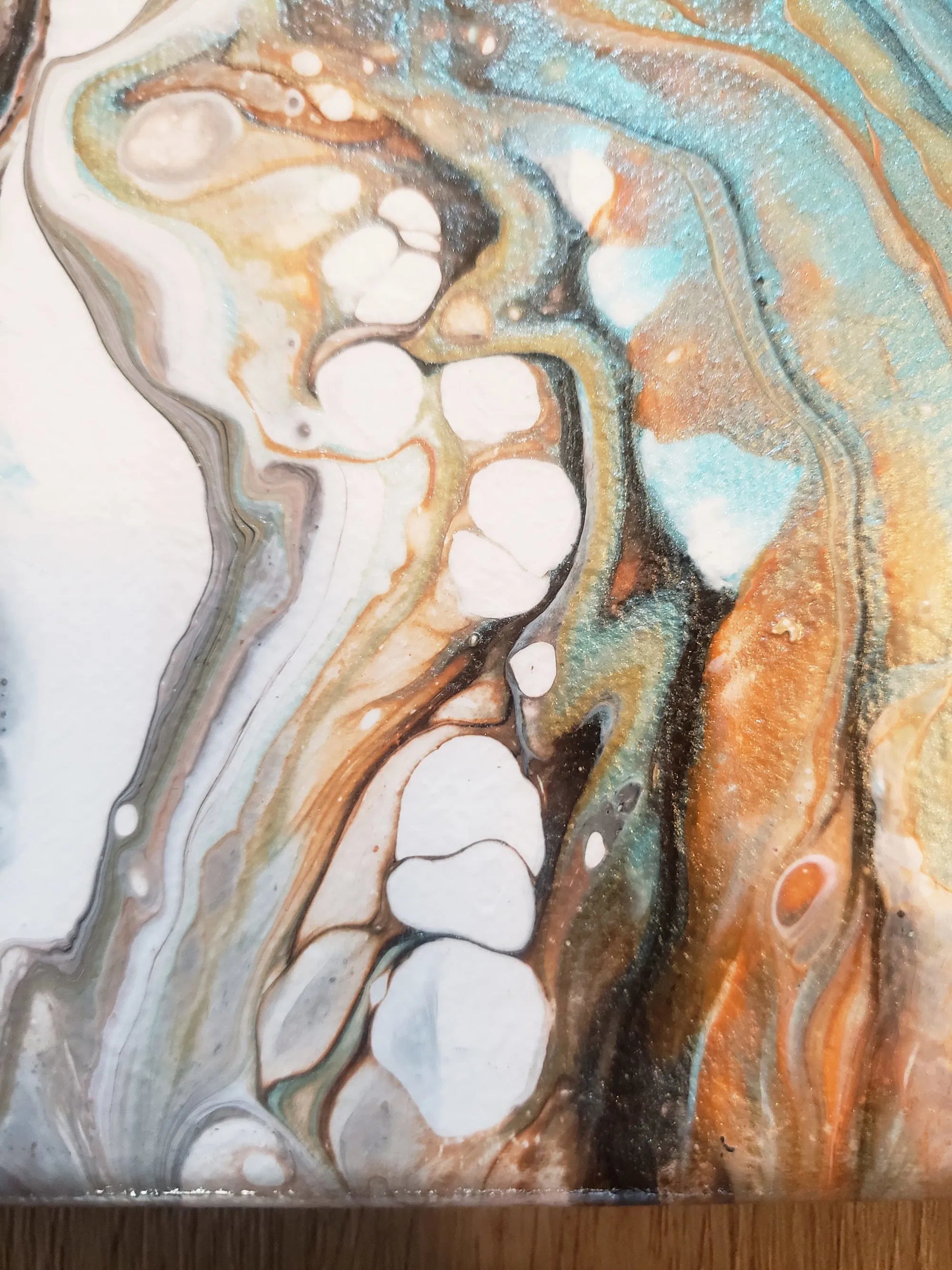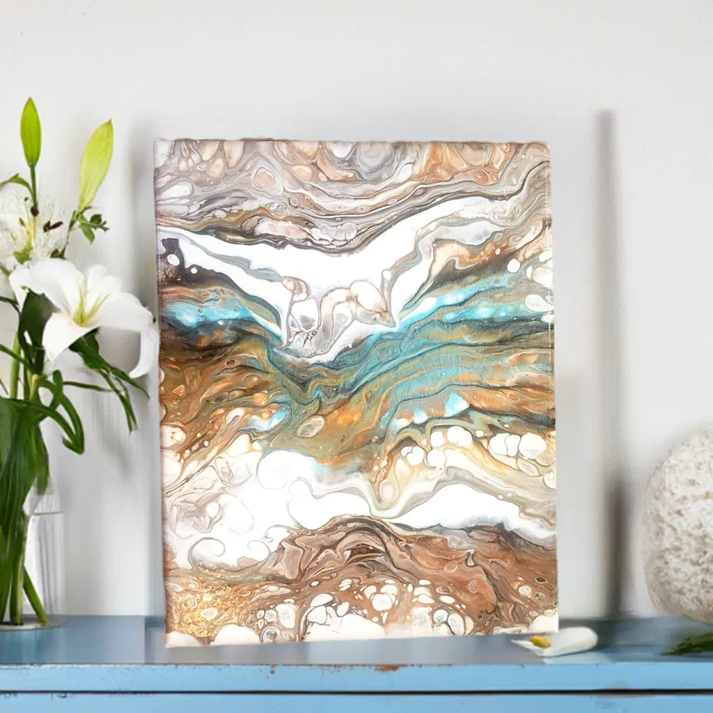 Add contemporary art to your space with this Acrylic Pour Painting. A stunning display of colors, depth, and fluid patterns created through the unique pouring technique with quality acrylic paints. The combination of rich hues, metallic colors, along with the beautiful gold, creates a dynamic and visually captivating piece that will make a statement in any room. High quality gloss liquid varnish applied for protection.