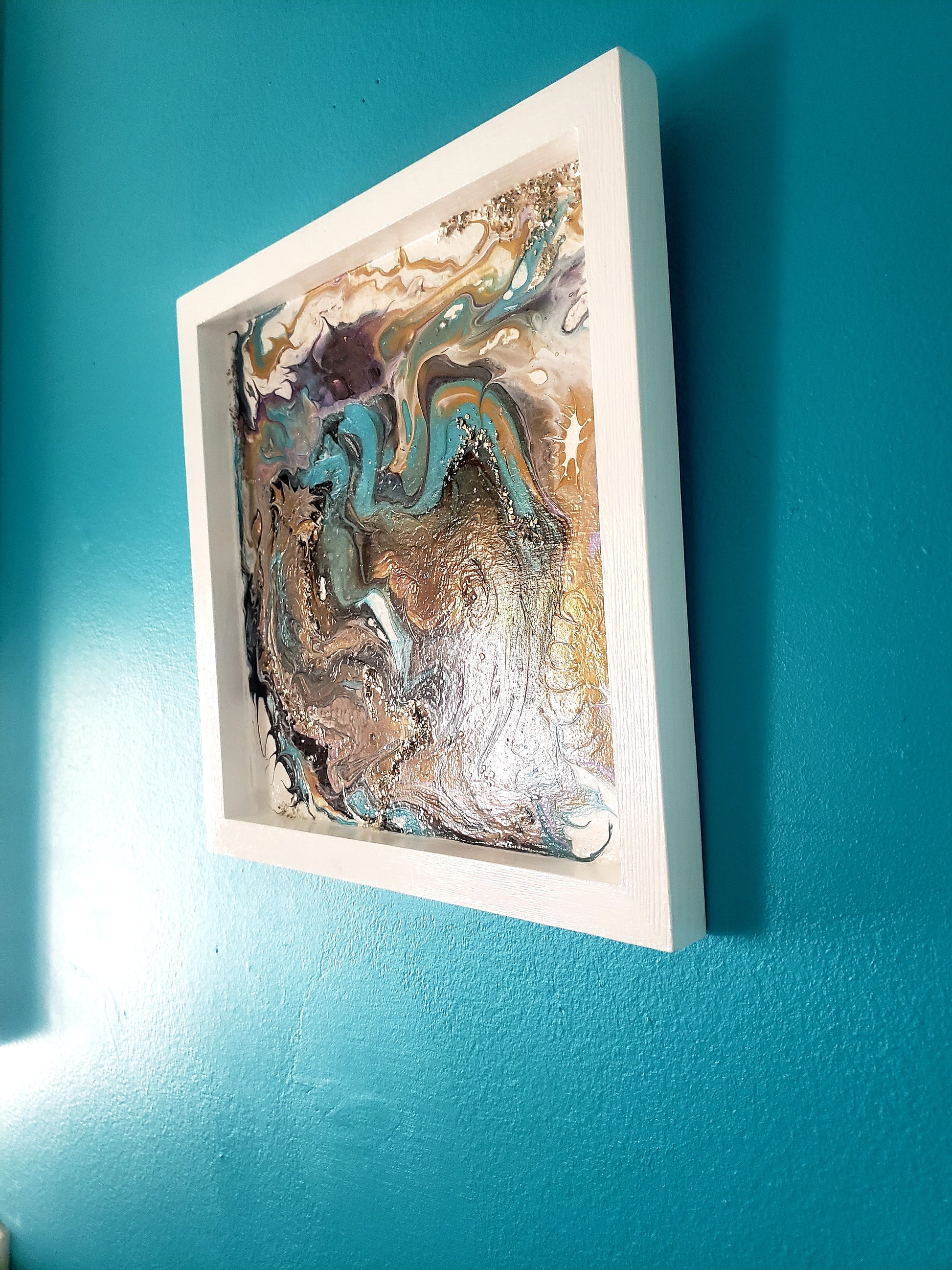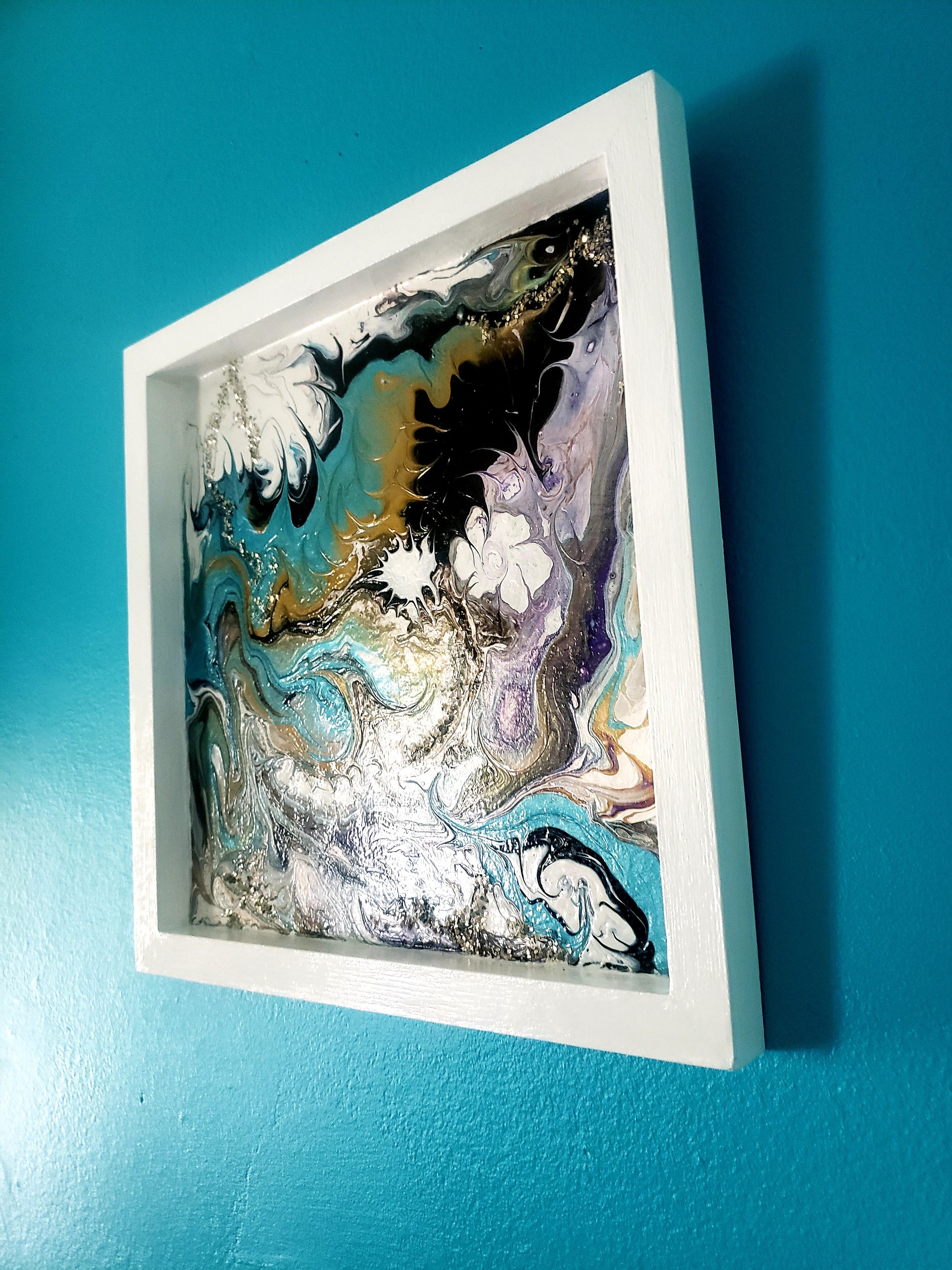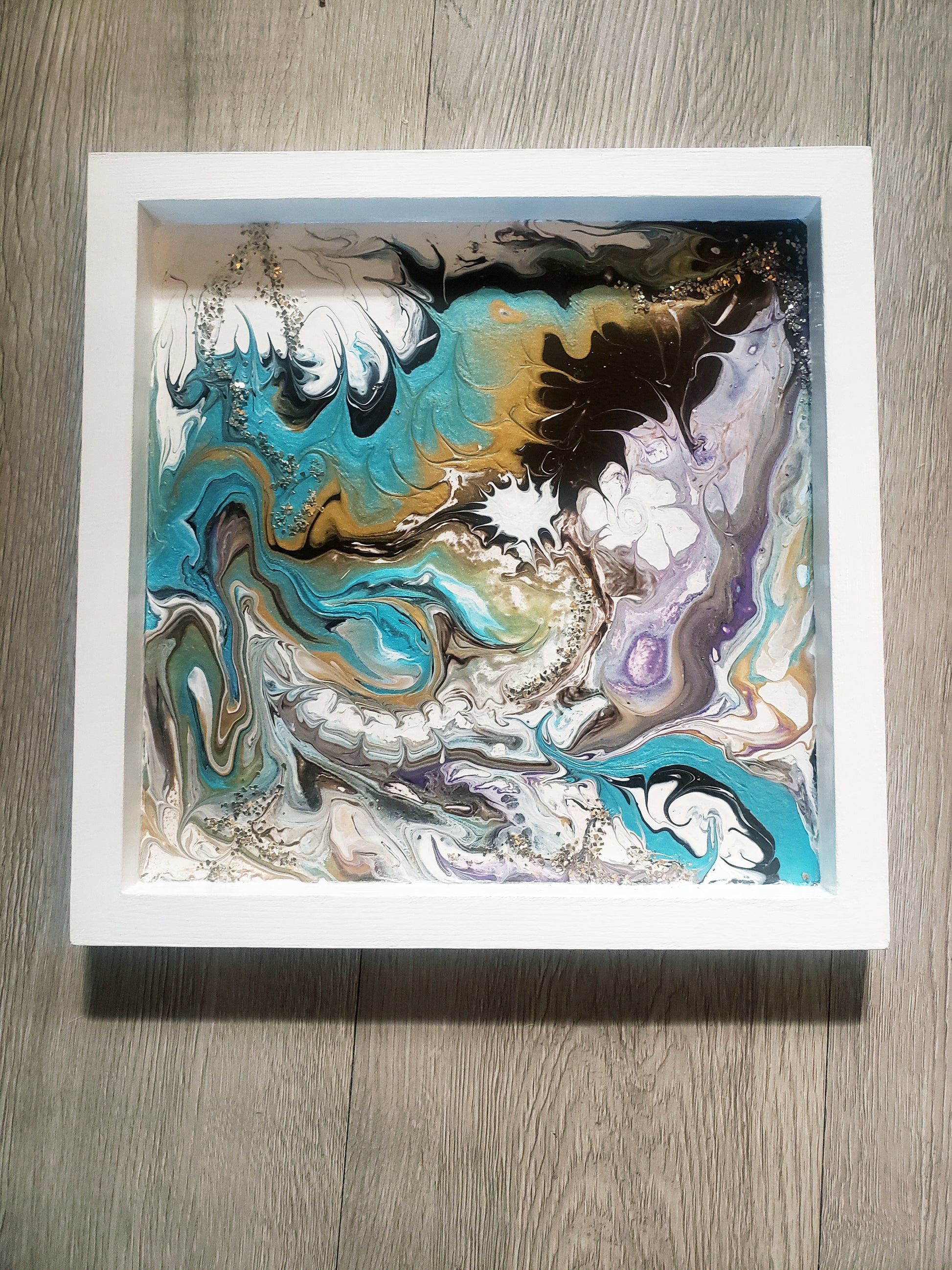 Add some contemporary art to your space with this Acrylic Pour Painting Set. A stunning display of colors, depth and fluid patterns created through a unique pouring technique with high quality acrylic paints. The combination of rich peacock hues, metallic shimmery colors, along with the beautiful pure gold, creates visually captivating pieces that will make a statement in any room. Each section of this piece will surely keep you gazing with the added touch of a shadow box. Glass glitter is incorporated across this artwork. Triple liquid gloss varnish applied for protection, durability and appeal.