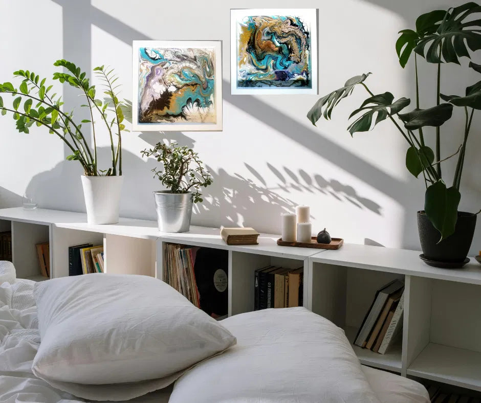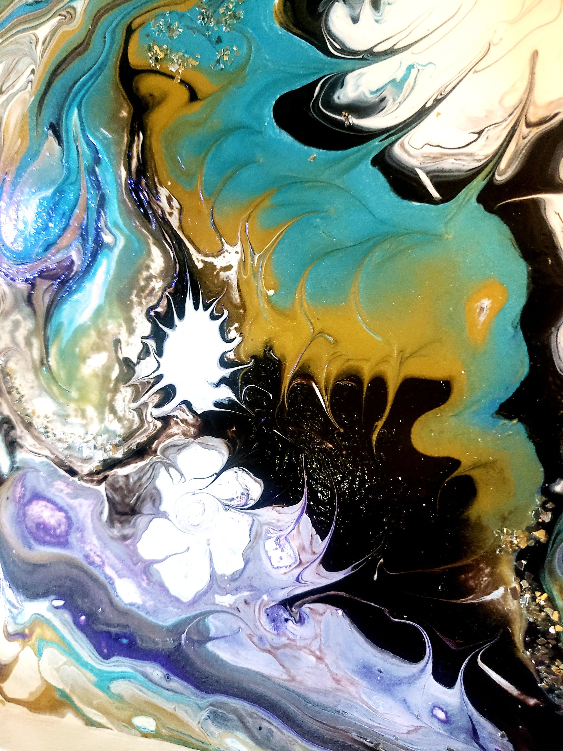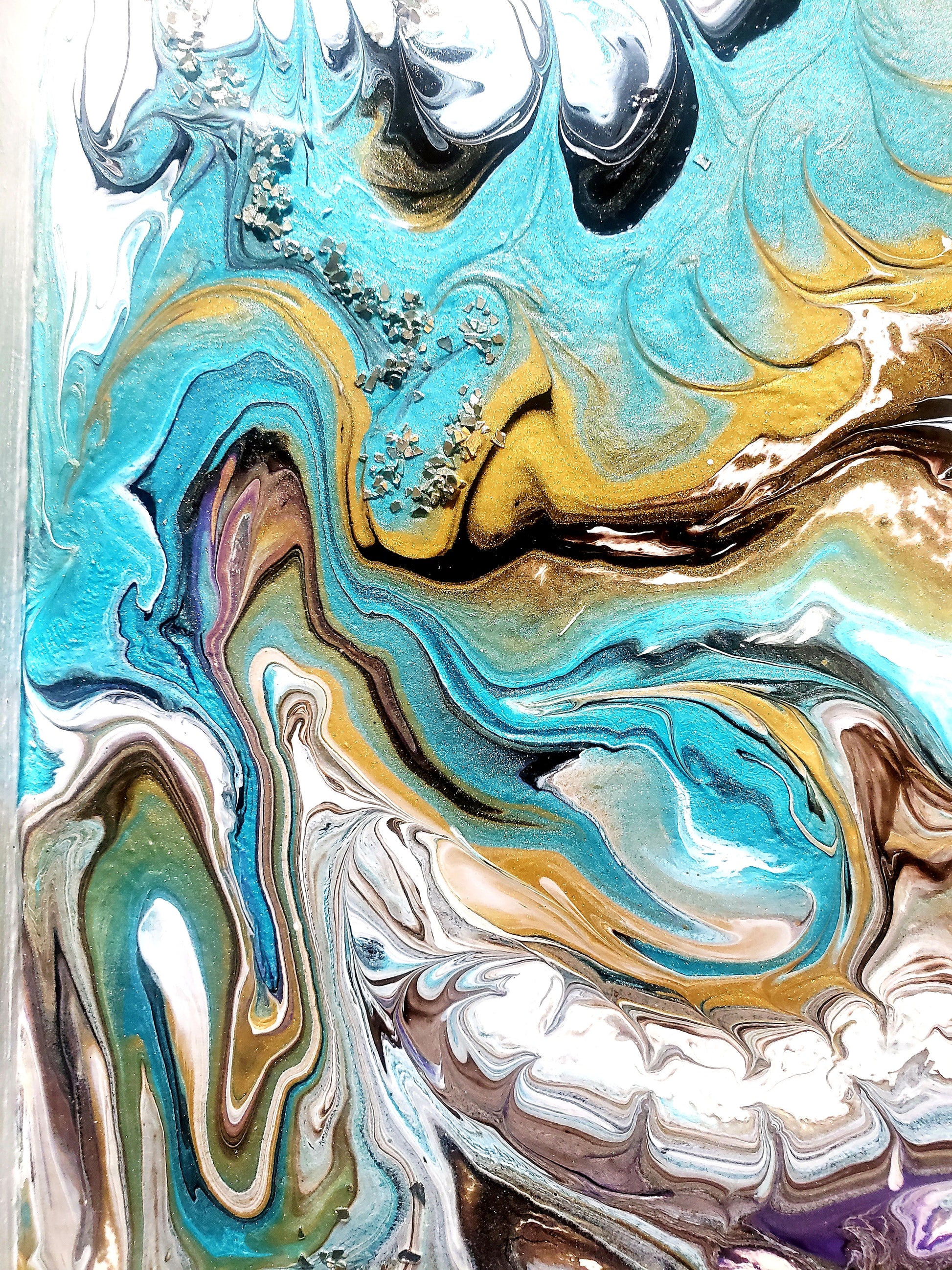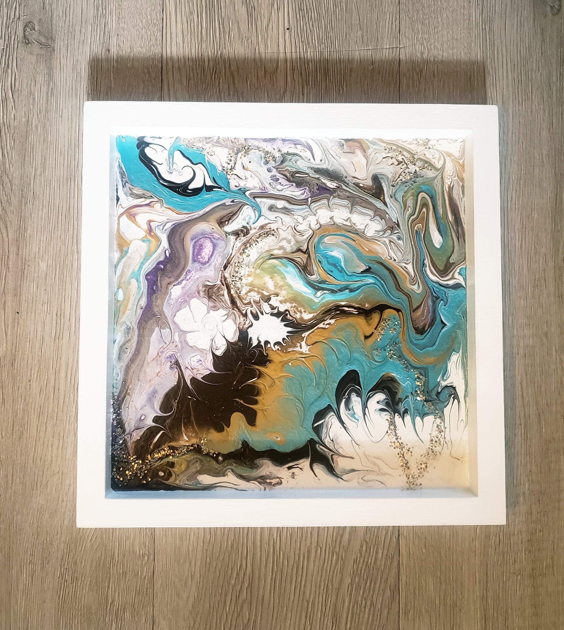Add some contemporary art to your space with this Acrylic Pour Painting Set. A stunning display of colors, depth and fluid patterns created through a unique pouring technique with high quality acrylic paints. The combination of rich peacock hues, metallic shimmery colors, along with the beautiful pure gold, creates visually captivating pieces that will make a statement in any room. Each section of this piece will surely keep you gazing with the added touch of a shadow box. Glass glitter is incorporated across this artwork. Triple liquid gloss varnish applied for protection, durability and appeal.