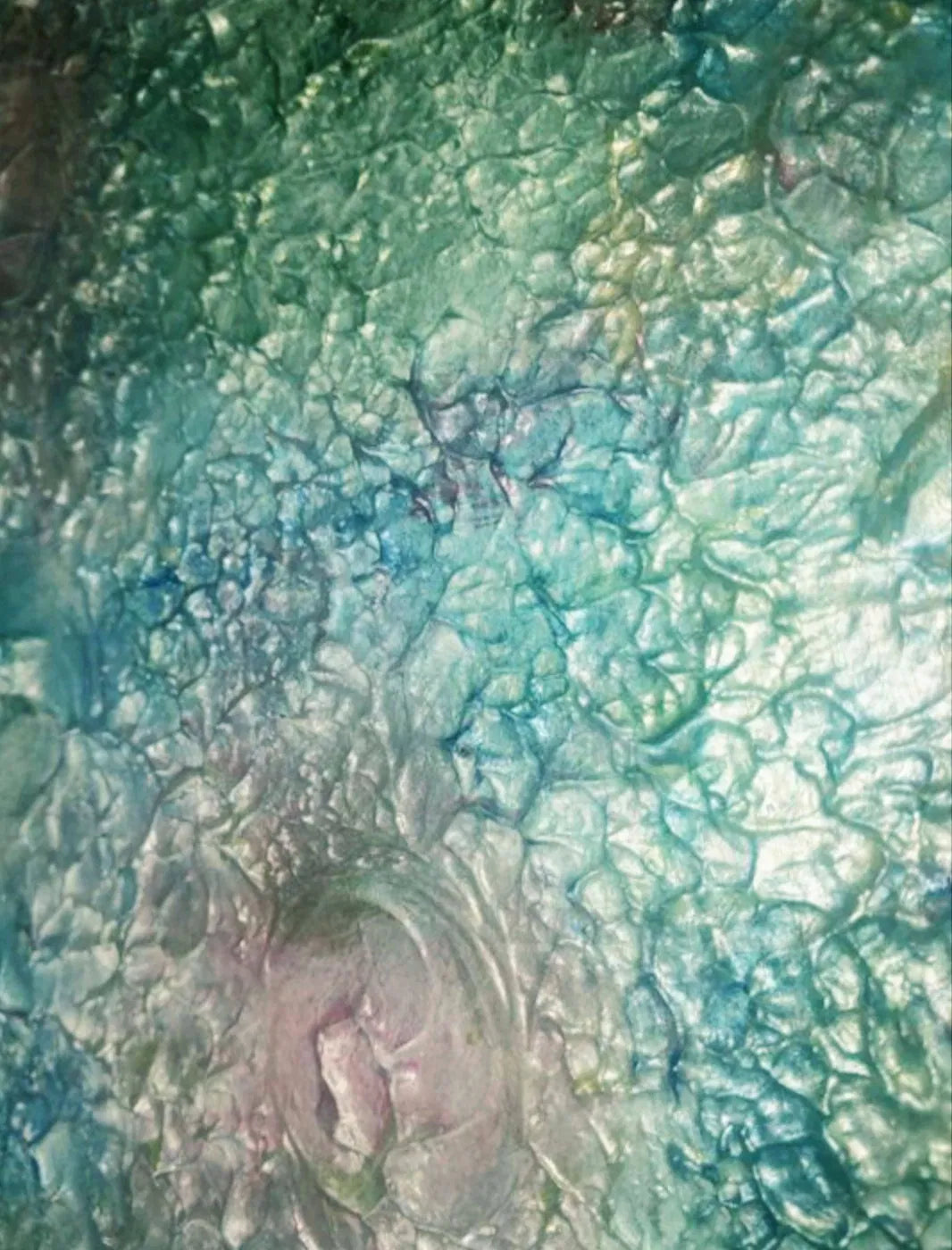 A unique display of colors, metallic shine and patterns created with quality acrylic paints. A textured medium spreads across this canvas for an intriguing appeal. The swirls and raised texture are fun to touch. Metallic tones of blue, pink, green, yellow and purple are fastidiously placed around the mixed media center. The circular center is dramatically shimmery with a yellow hue aura. Make a statement with some art in your life. Spray semi-gloss varnish applied for protection and appeal.