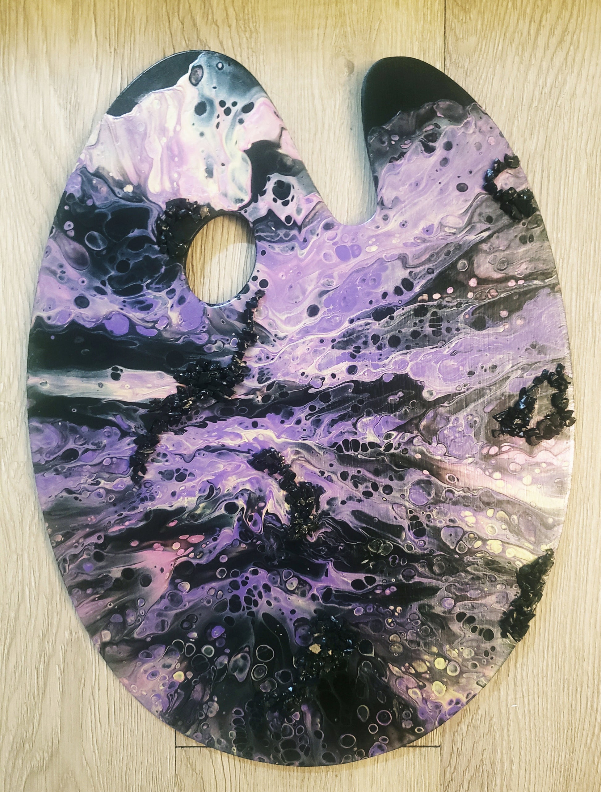 Add contemporary Art to your space with this Acrylic Pour technique on wood. A stunning display of colors, depth, and fluid patterns created through the unique pouring technique with quality acrylic paints. The combination of rich hues and metallic colors, create a dynamic and visually captivating piece that will make a statement in any room. High quality satin liquid varnish applied for protection, durability and appeal.