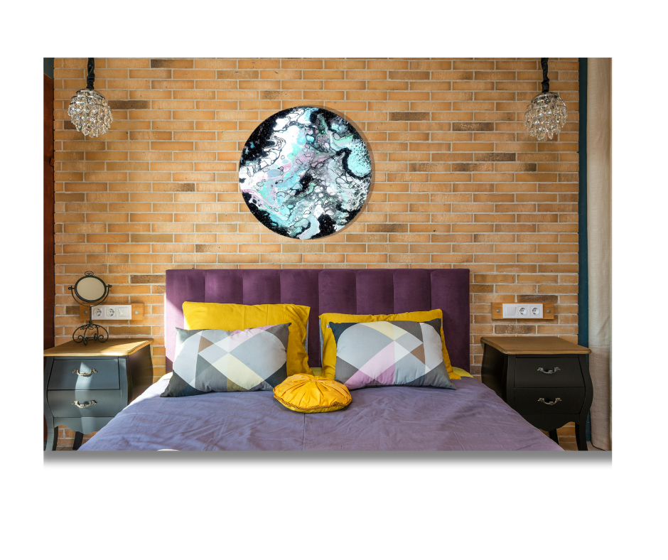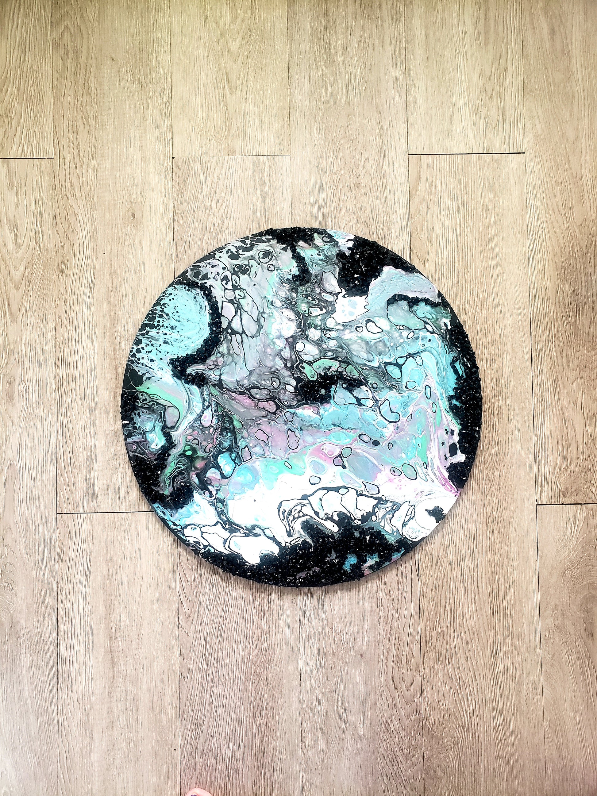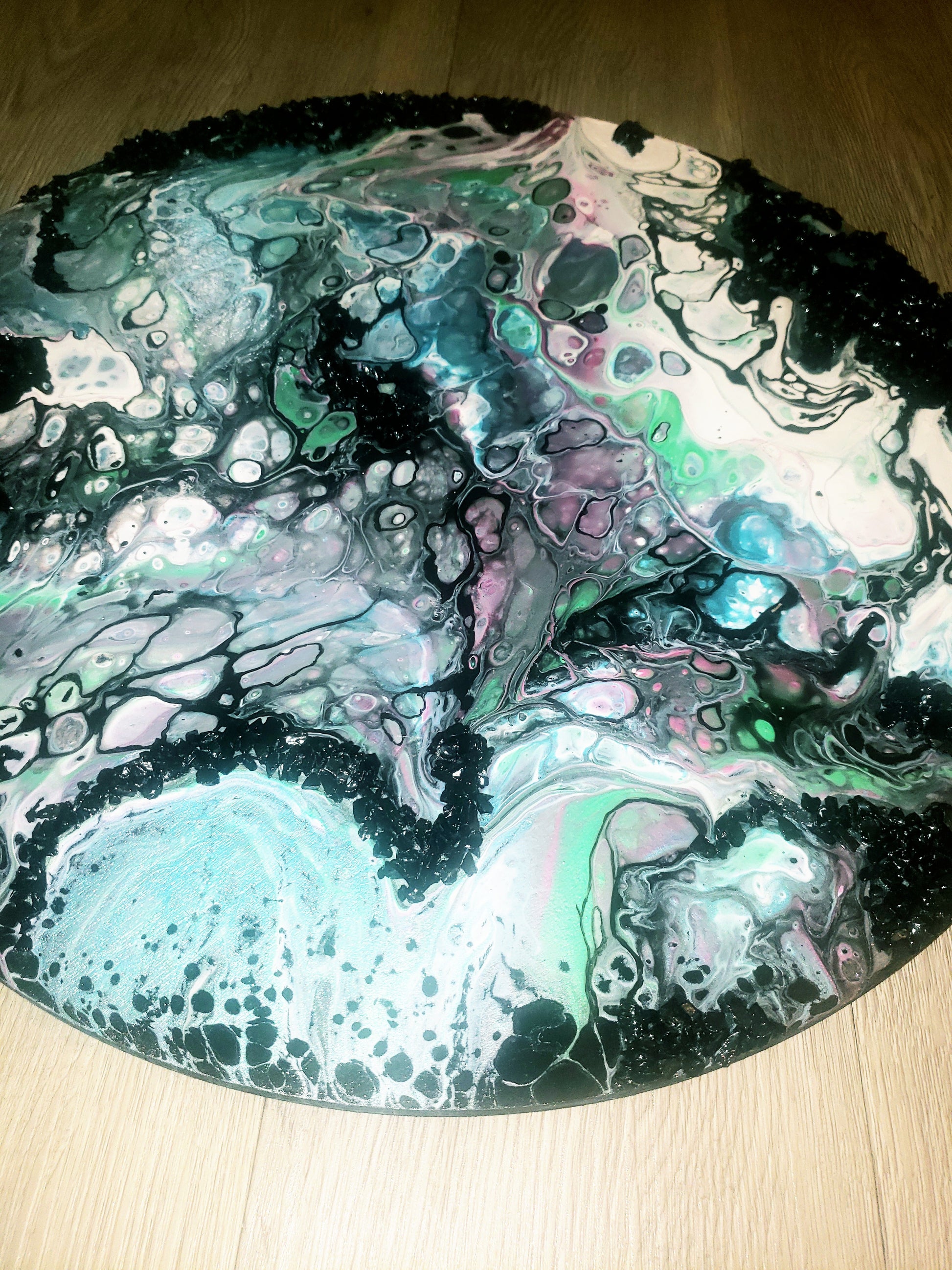 Hang this piece in your home or office to add a burst of color in an artistic expression. Fluid art expression on a large Wood Round. Transform your space with this intriguing form of Art. Metallic pink, white, blue, green and silver hues flow through this colorful piece. Throughout this piece is black crushed glass for an added embellishment to add to its beauty. Triple liquid gloss varnished for protection, durability and appeal.