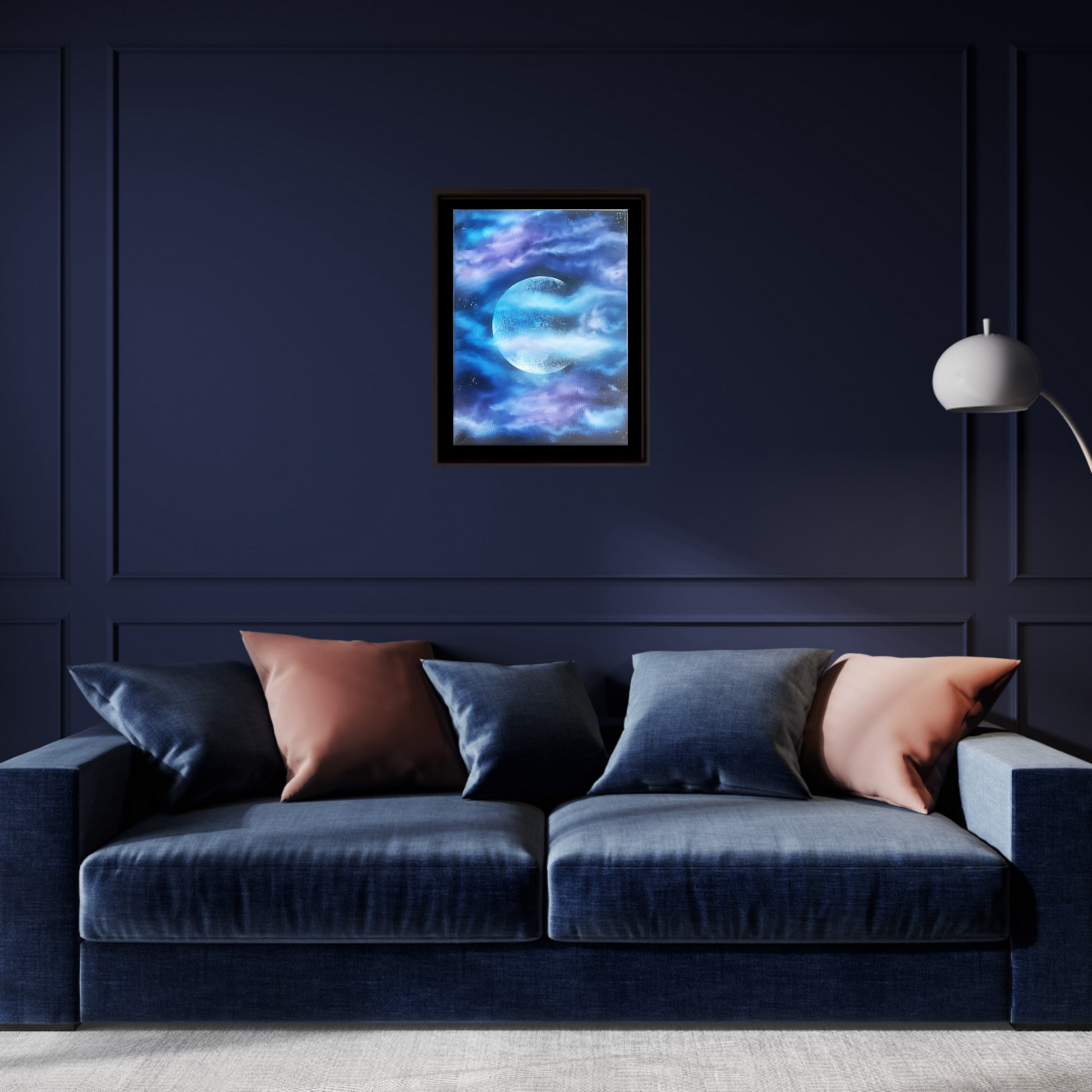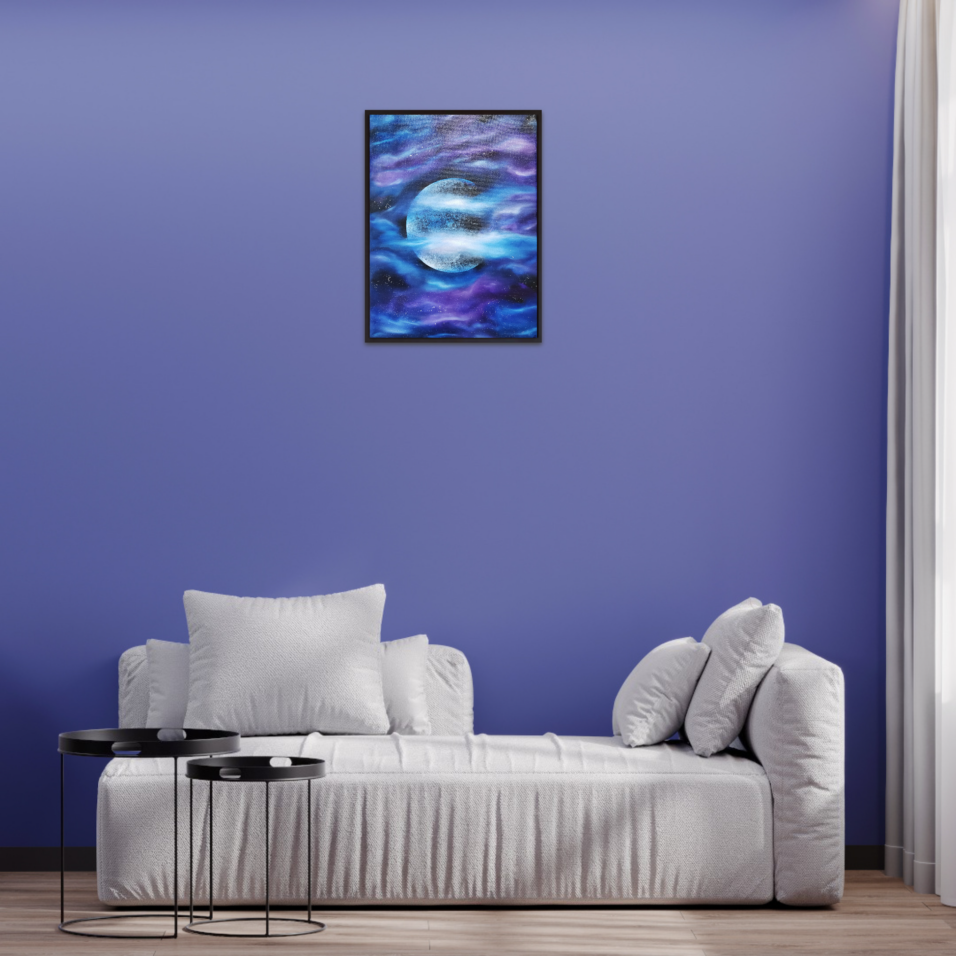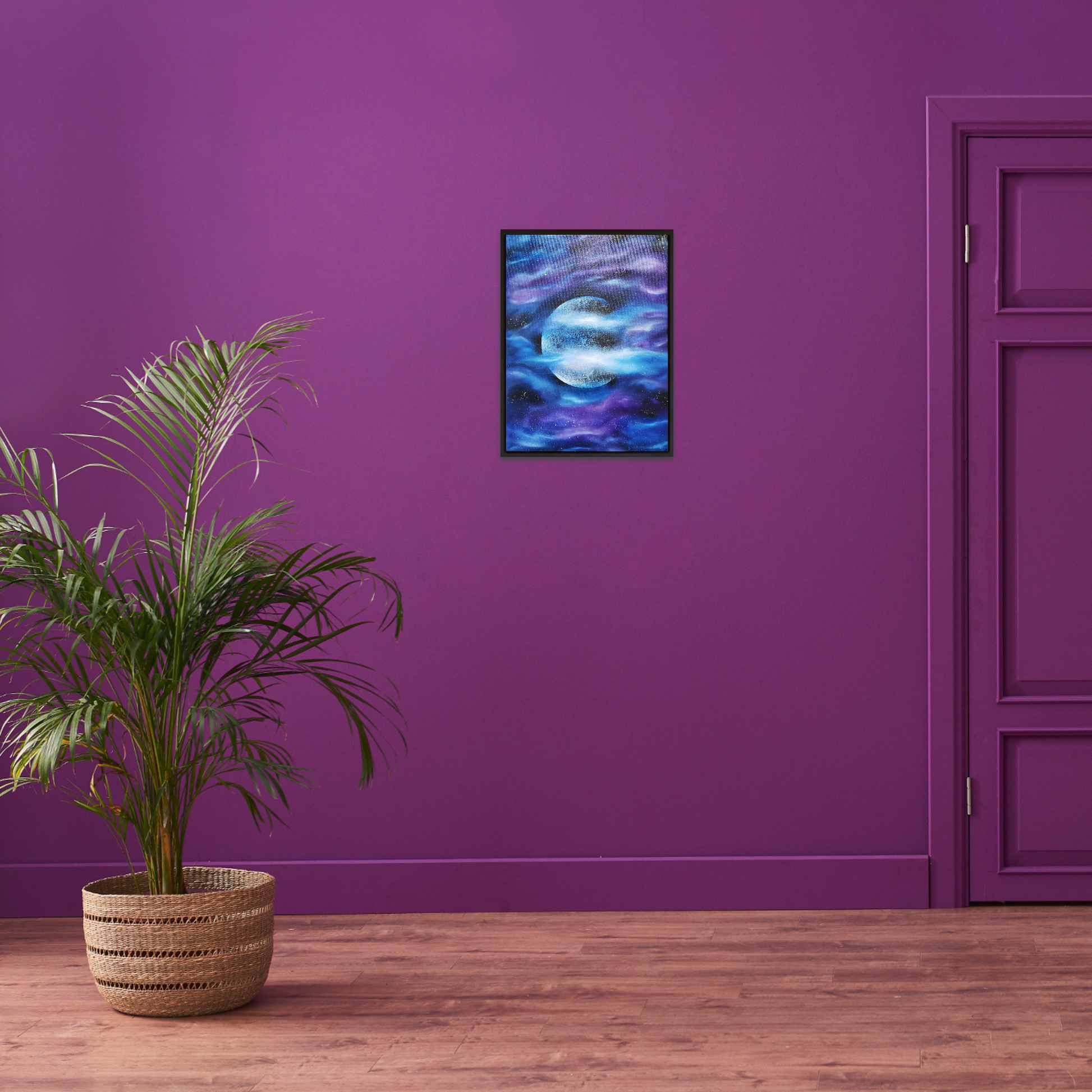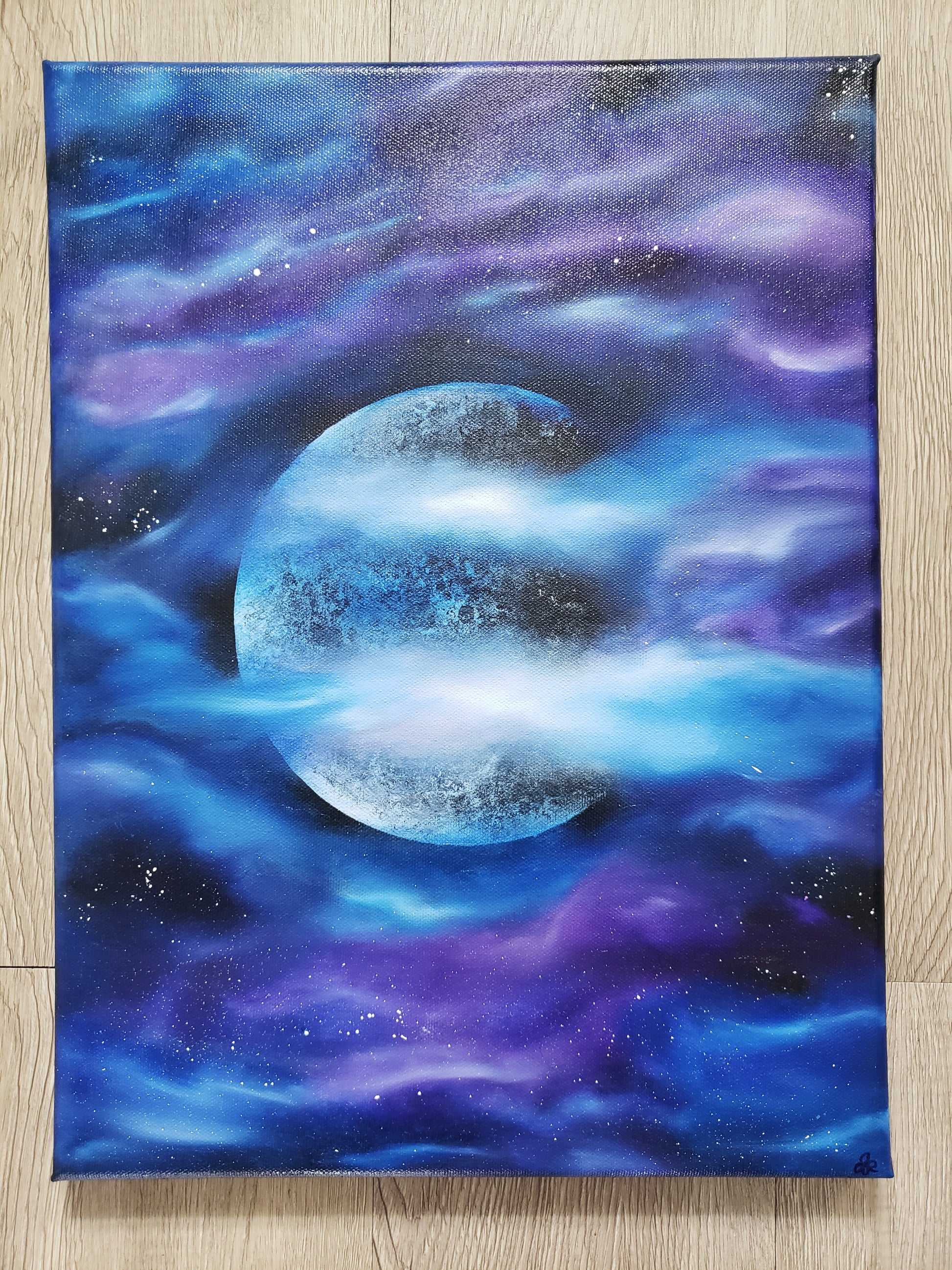 A bright, detailed moon surrounded by flowing hues of purple and blue forming celestial clouds. Hand painted with high quality oil paints. Transform your space with this intriguing Oil Painting, created with the intention of making the Moon the focal point in this Art piece. Frame not included.