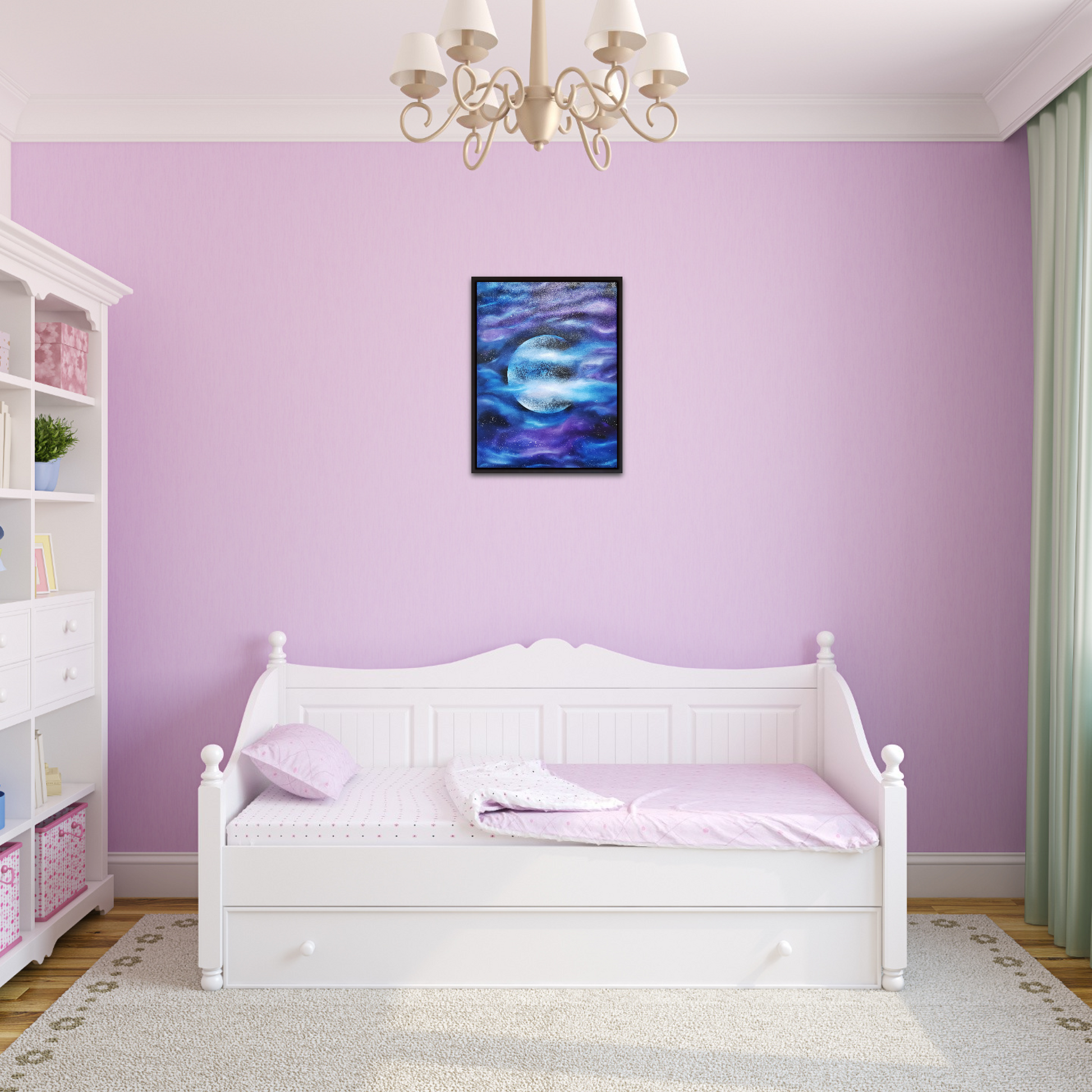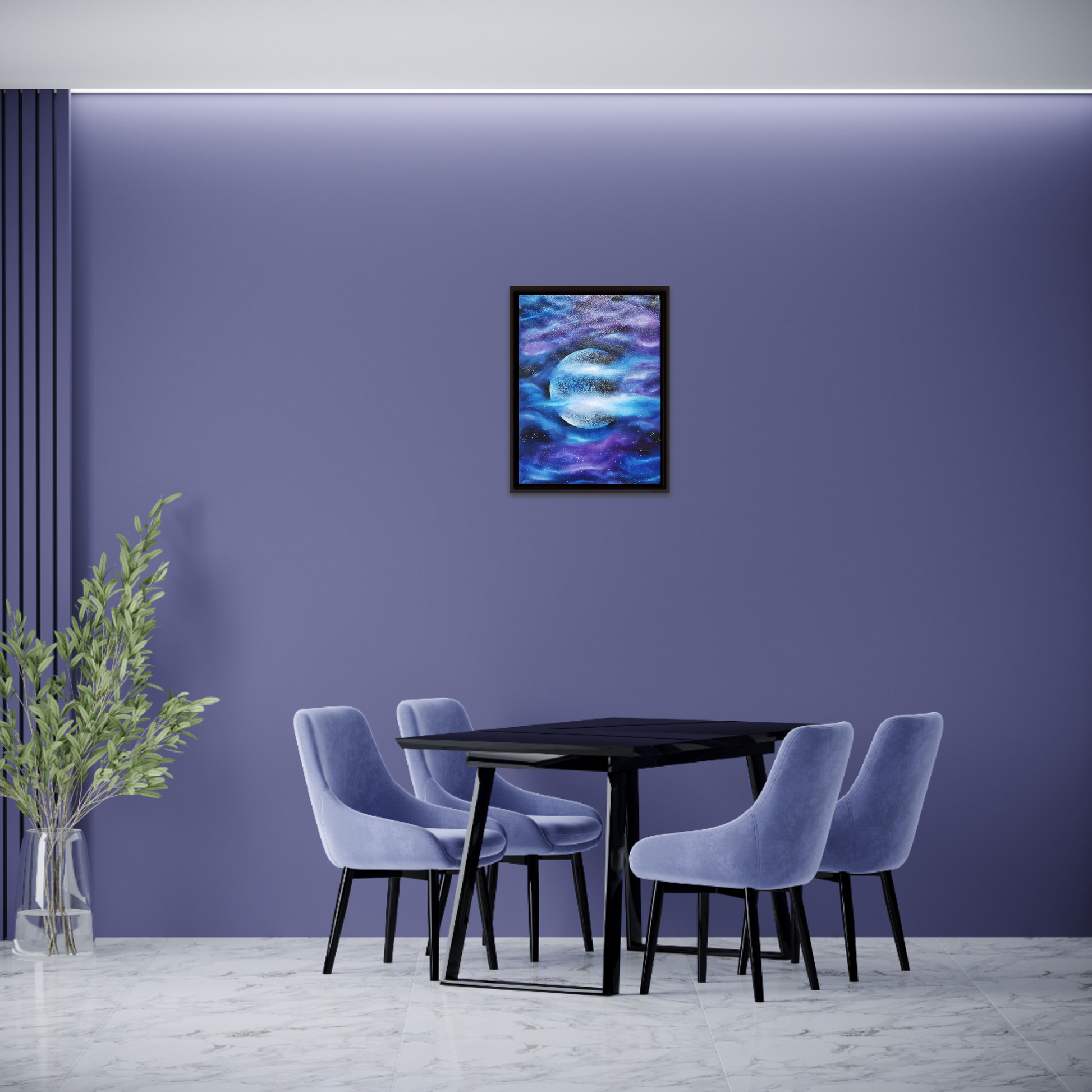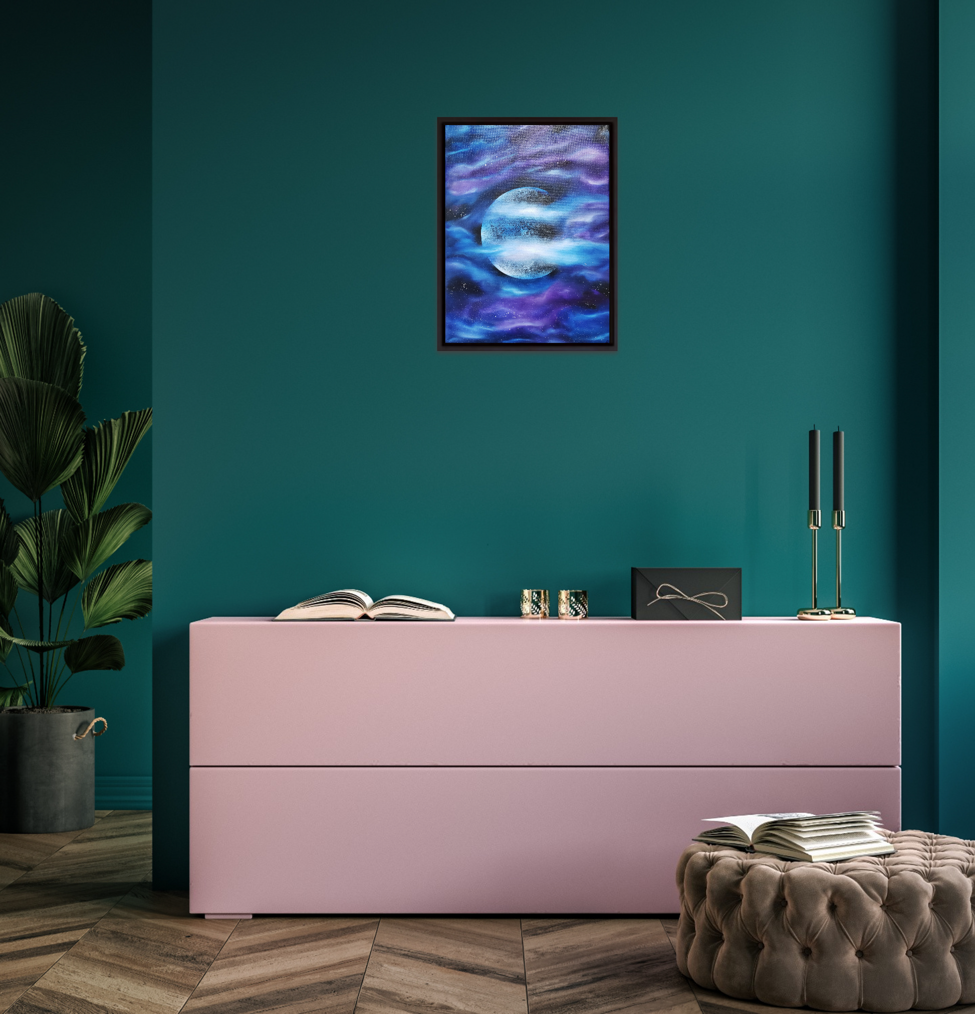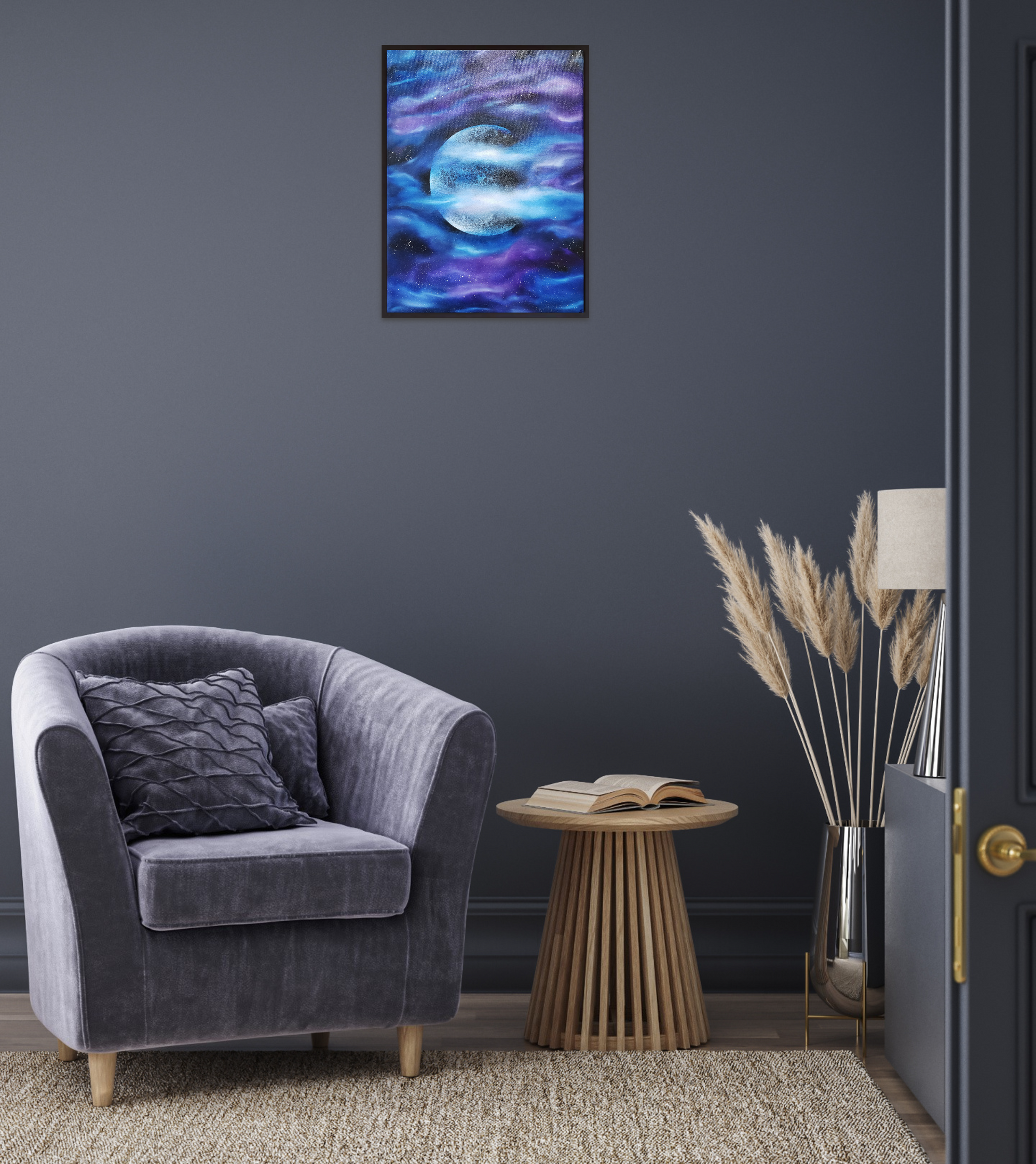 A bright, detailed moon surrounded by flowing hues of purple and blue forming celestial clouds. Hand painted with high quality oil paints. Transform your space with this intriguing Oil Painting, created with the intention of making the Moon the focal point in this Art piece. Frame not included.