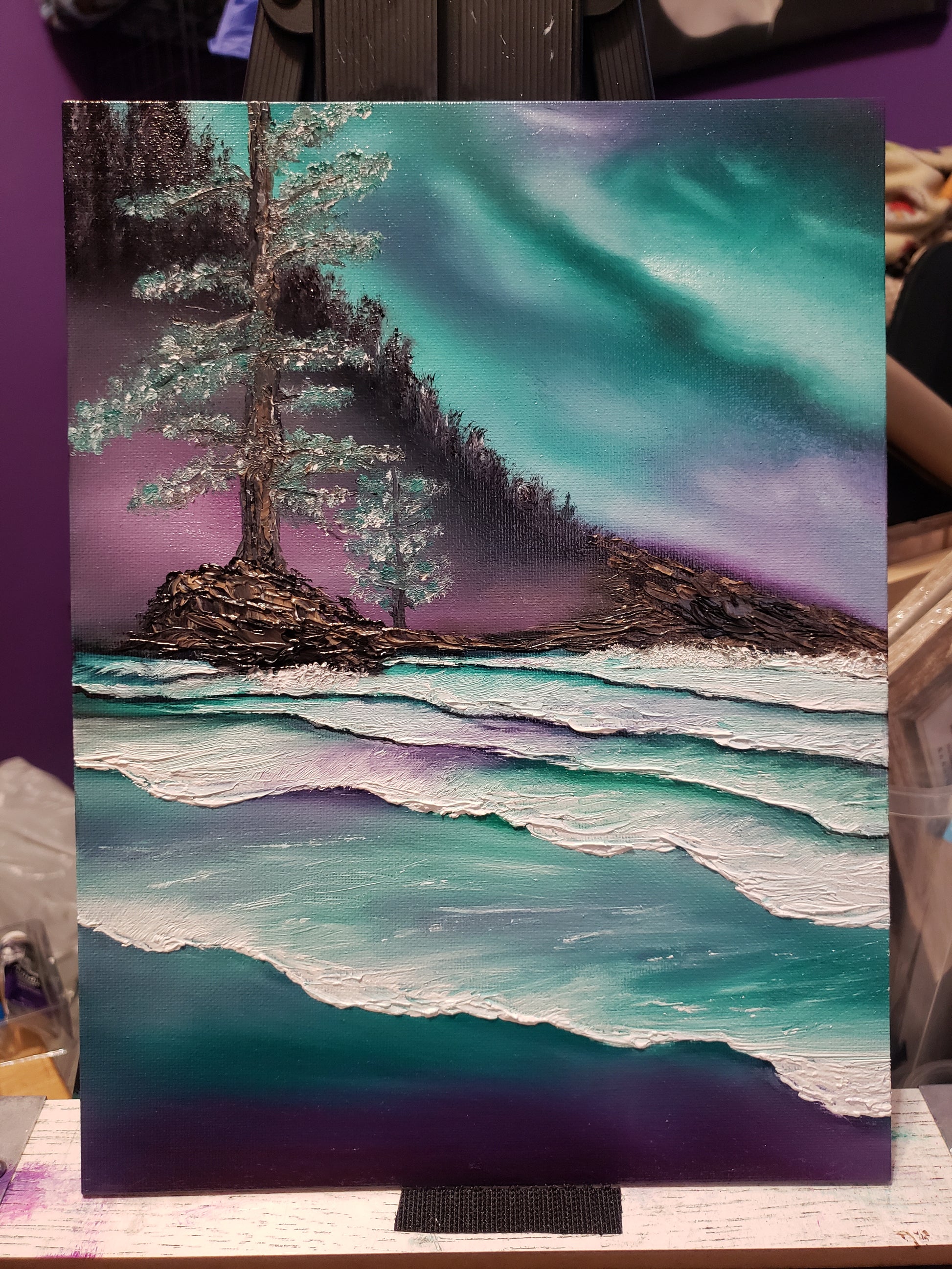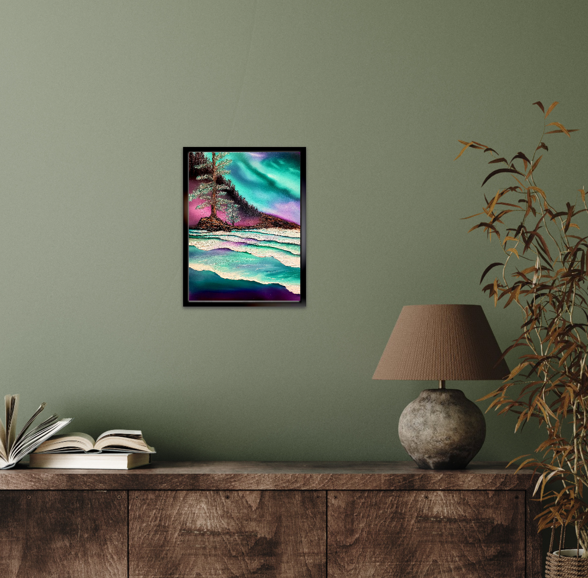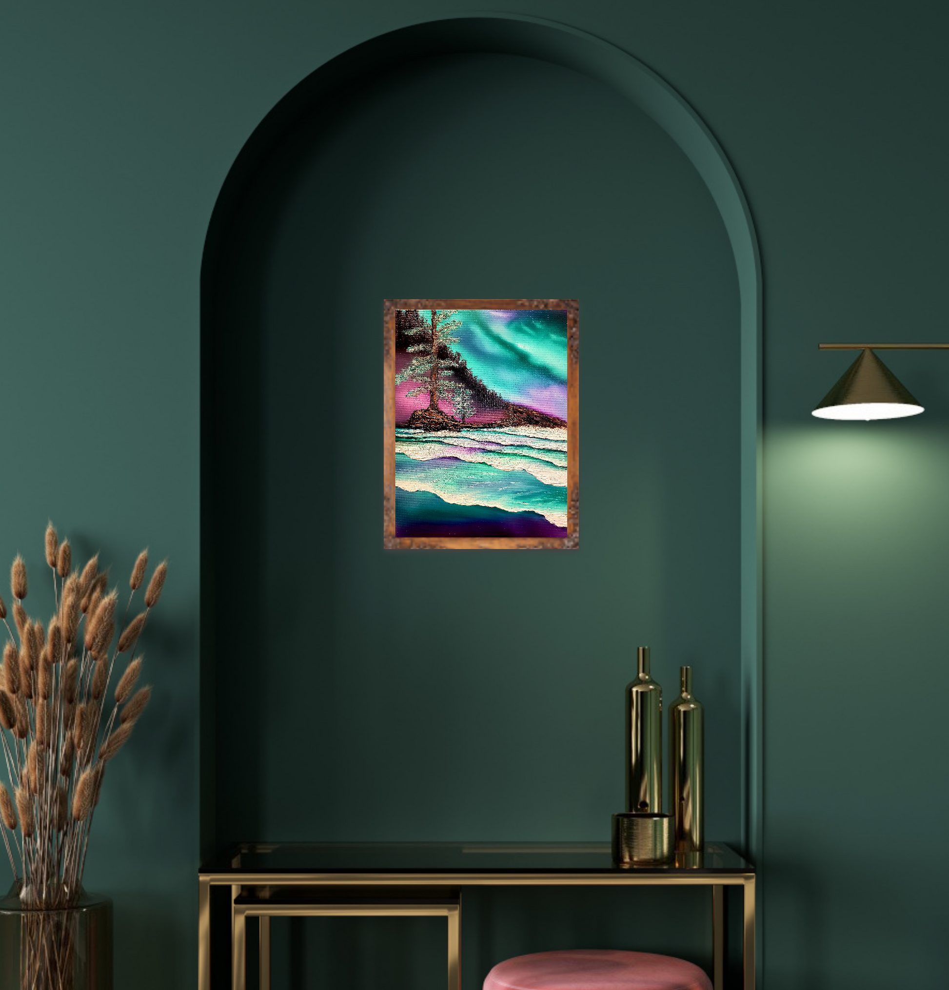 This Oil Painting captures the ethereal beauty of the skies above and waters below, with their soft hues blending seamlessly. Trees and waves exude a rich texture that beckons to be touched, the detailed waves seem to come alive with every brushstroke. The high-quality oil paints used in this hand-painted piece enhance its depth and richness. Immerse yourself in this captivating artwork and let it transform your space into a realm of intrigue and wonder. Hand-painted with premium oil paints. Black metal matte floating frame is included and assembled. All work is original, no copies or prints. The cost of the frame is included in the final price, price also reflects the artwork, cost of the frame and assembly.