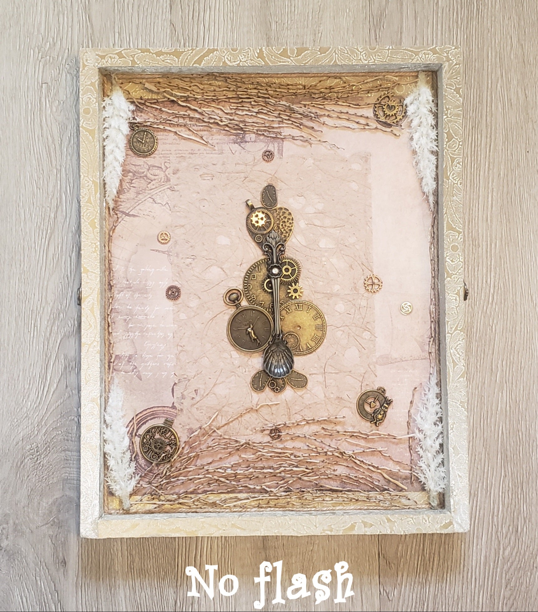 Handcrafted Steampunk Shadow Box. White outer boarders with small steampunk accents for added appeal from the sides. Main boarders along with the inner boarders are embellished with textured gold material that gives an amazing shine and changes a bit on the angel you fixate on. Inside the shadow box are beautiful hues of gold, bronze, tan and brown. The centerpiece is an antique styled decorative spoon that is surrounded with clocks, gears and other eye-catching embellishments. The backdrop adds very appealing effect to the entire piece, bringing it all together. Hang this in your home/office and add some creativity and shine to your space. Frame not included.