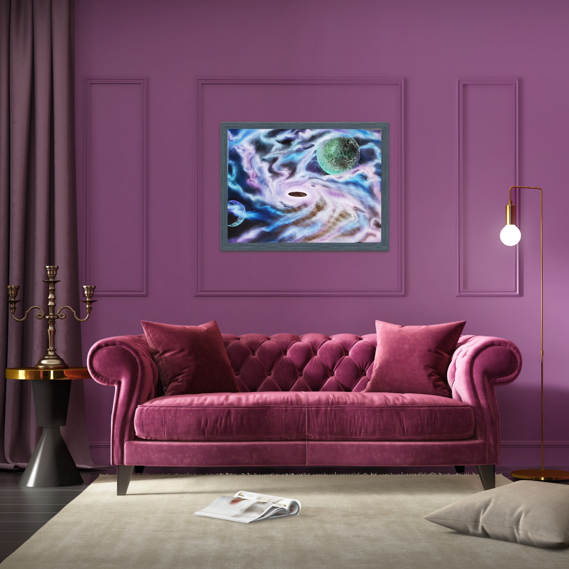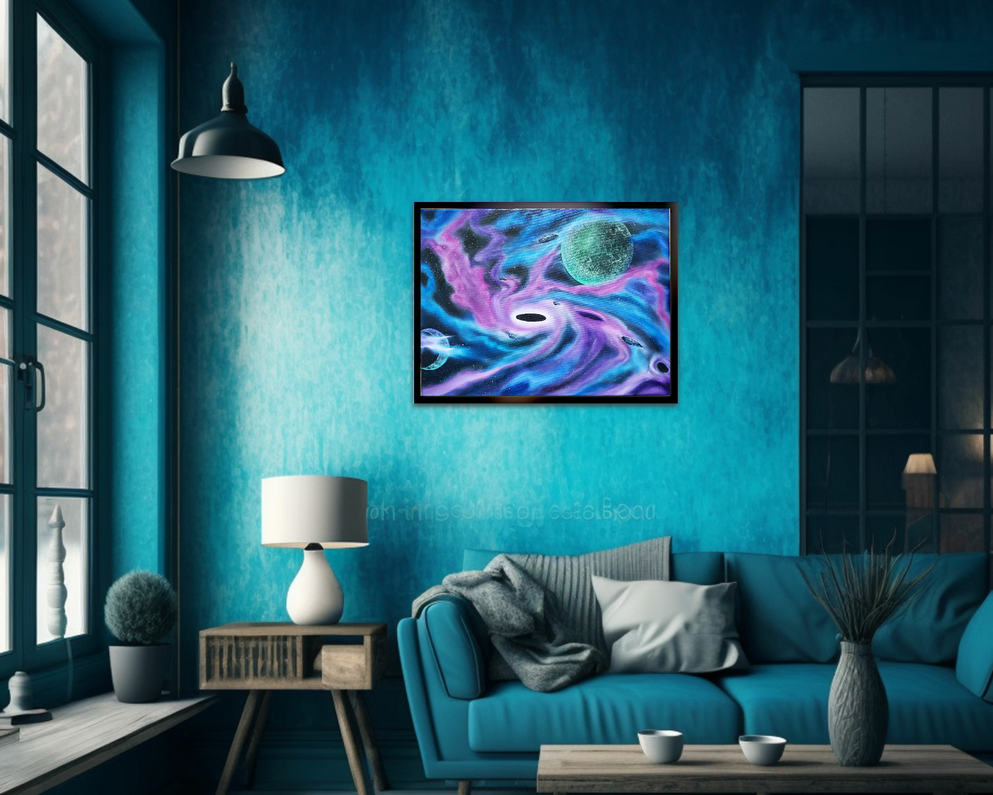 Space themed Oil Painting. A black hole in space engulfing all its surroundings. Detailed radiant moons surrounded by a multiplicity of vivid hues. Selective placement of stars are incorporated gracefully. Hand painted with high quality oil paints. Transform your space with this intriguing Oil Painting, created with the intention of making this black hole the focal point in this expressive piece. Frame not included.