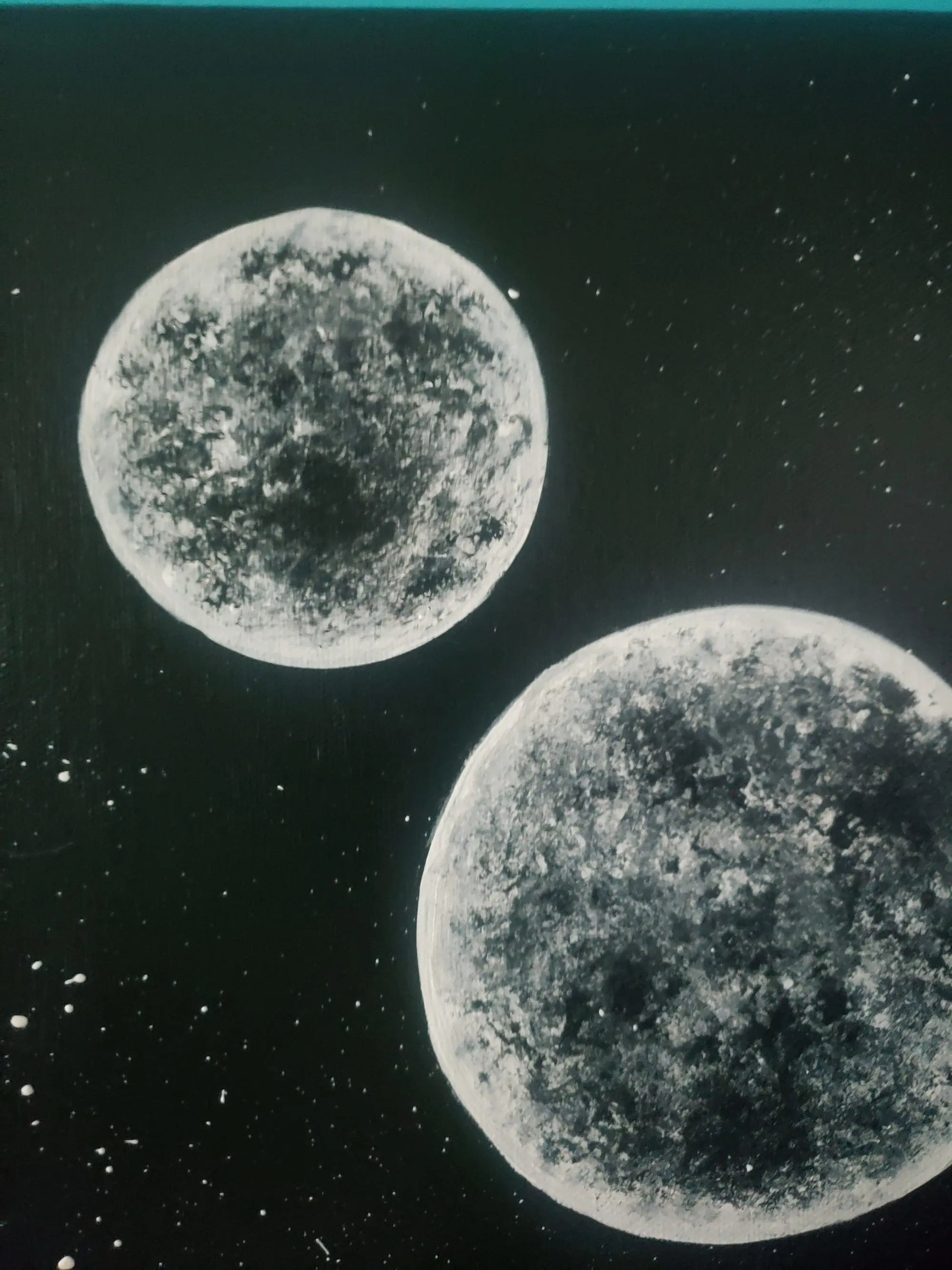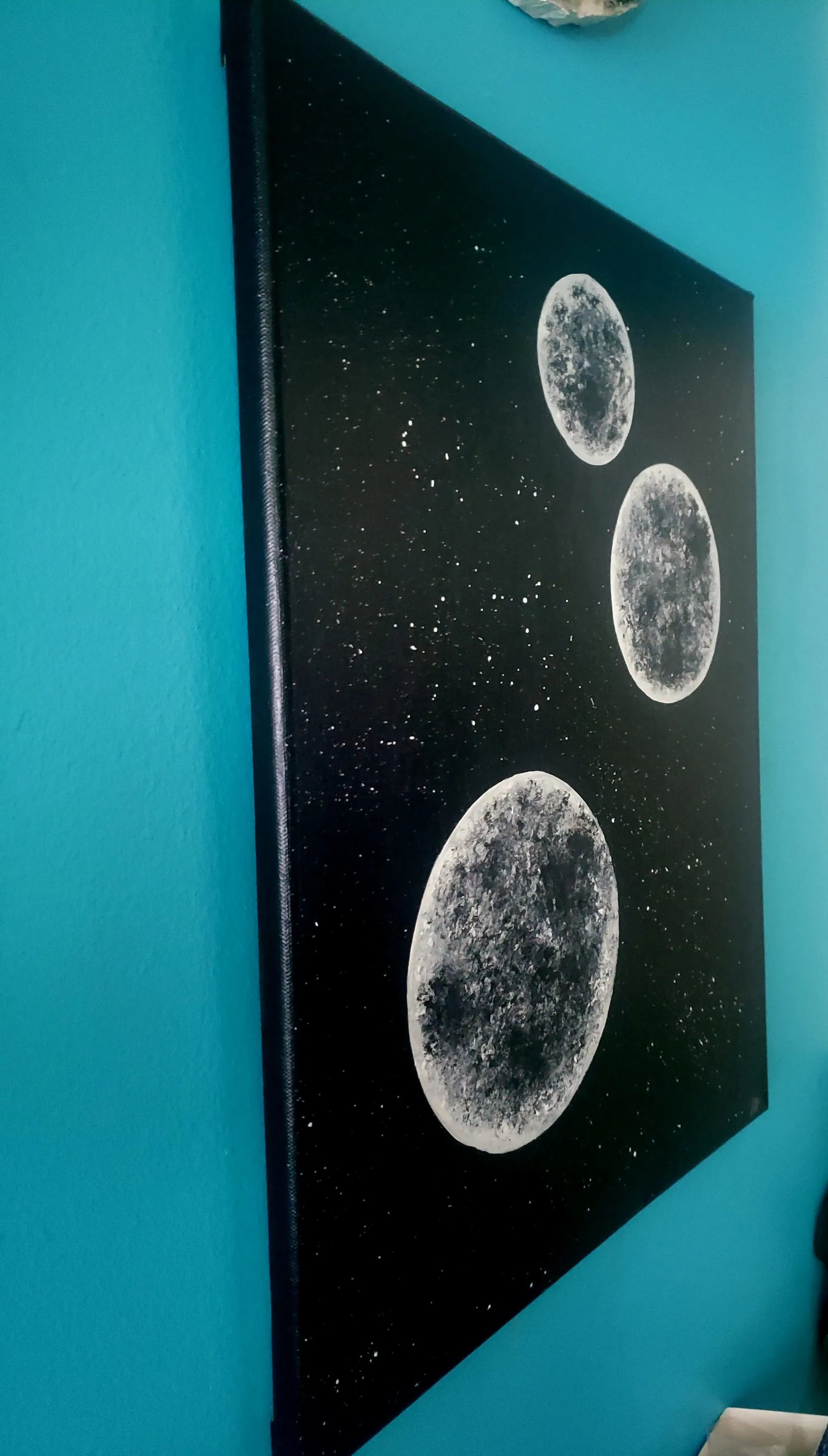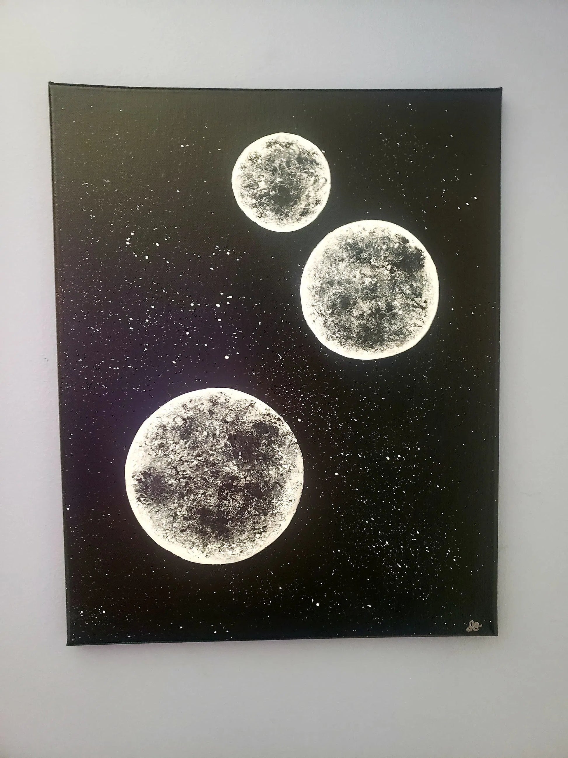 Acrylic black and white painting. Three clusters of detailed moons, surrounded by intriguing stars and shooting stars, how many do you see? These three moons are hand painted. Intention of having this piece encompass black and white only, white representing pure light while black represents darkness, which can be embodied in the cosmos. Frame not included.