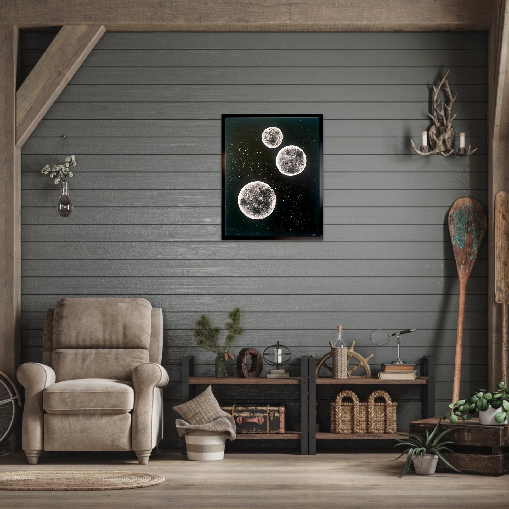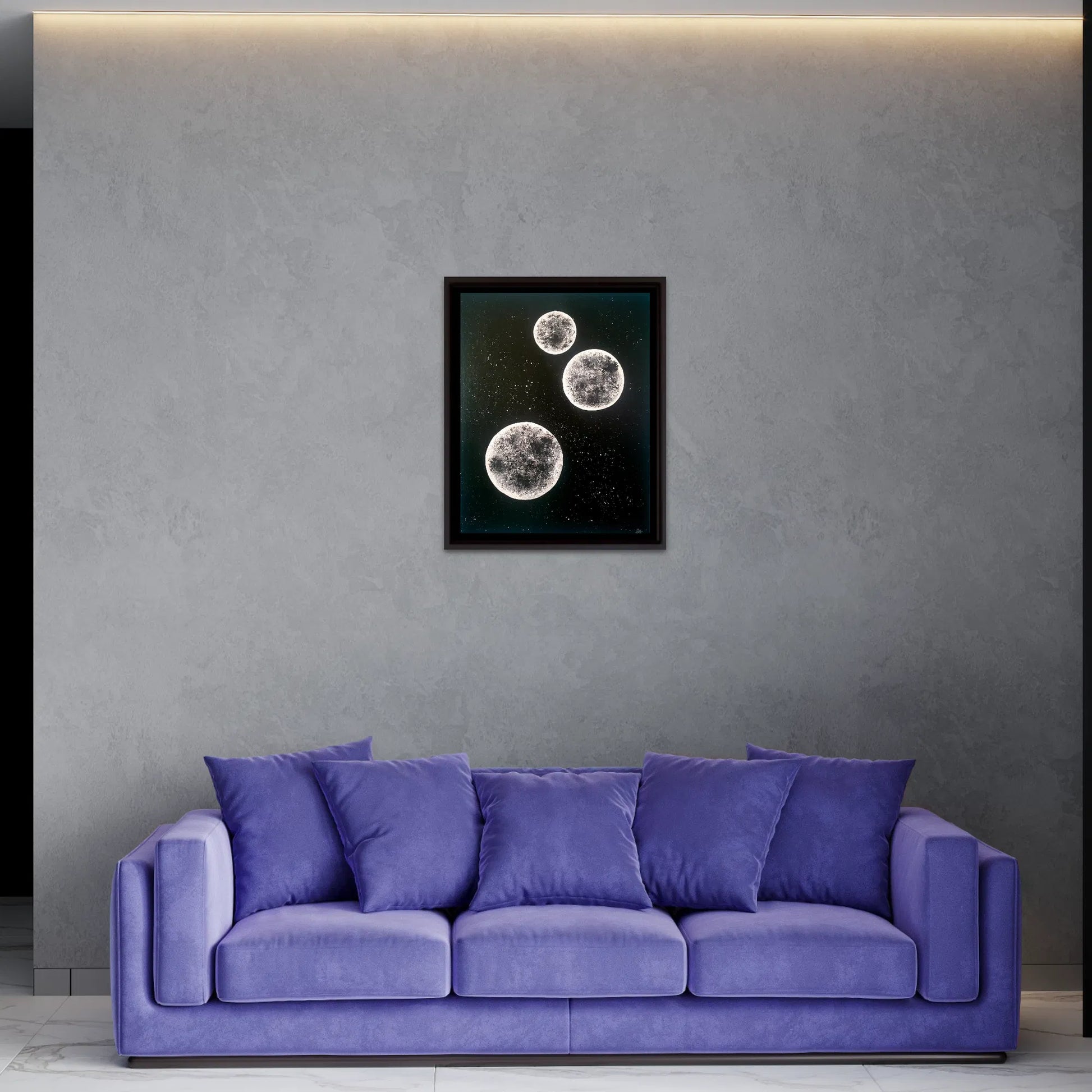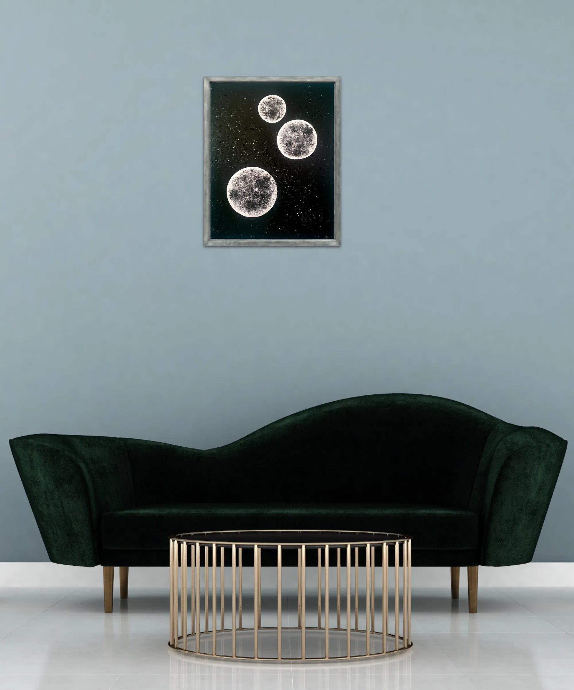 Acrylic black and white painting. Three clusters of detailed moons, surrounded by intriguing stars and shooting stars, how many do you see? These three moons are hand painted. Intention of having this piece encompass black and white only, white representing pure light while black represents darkness, which can be embodied in the cosmos. Frame not included.