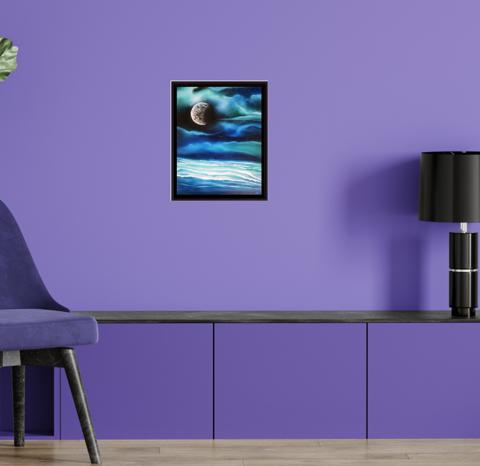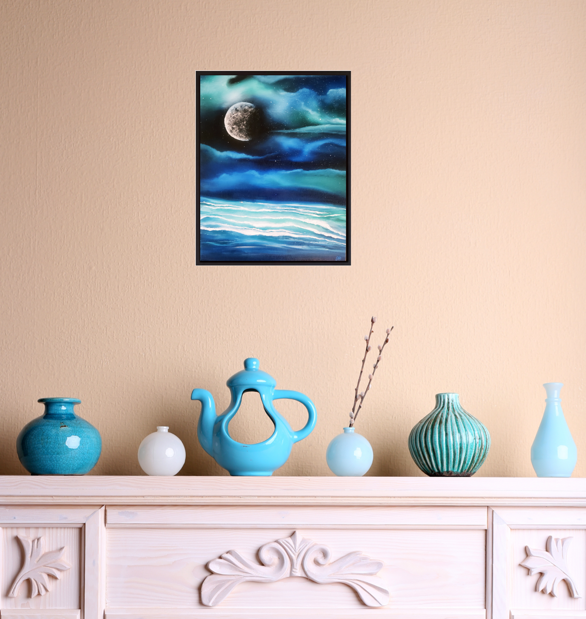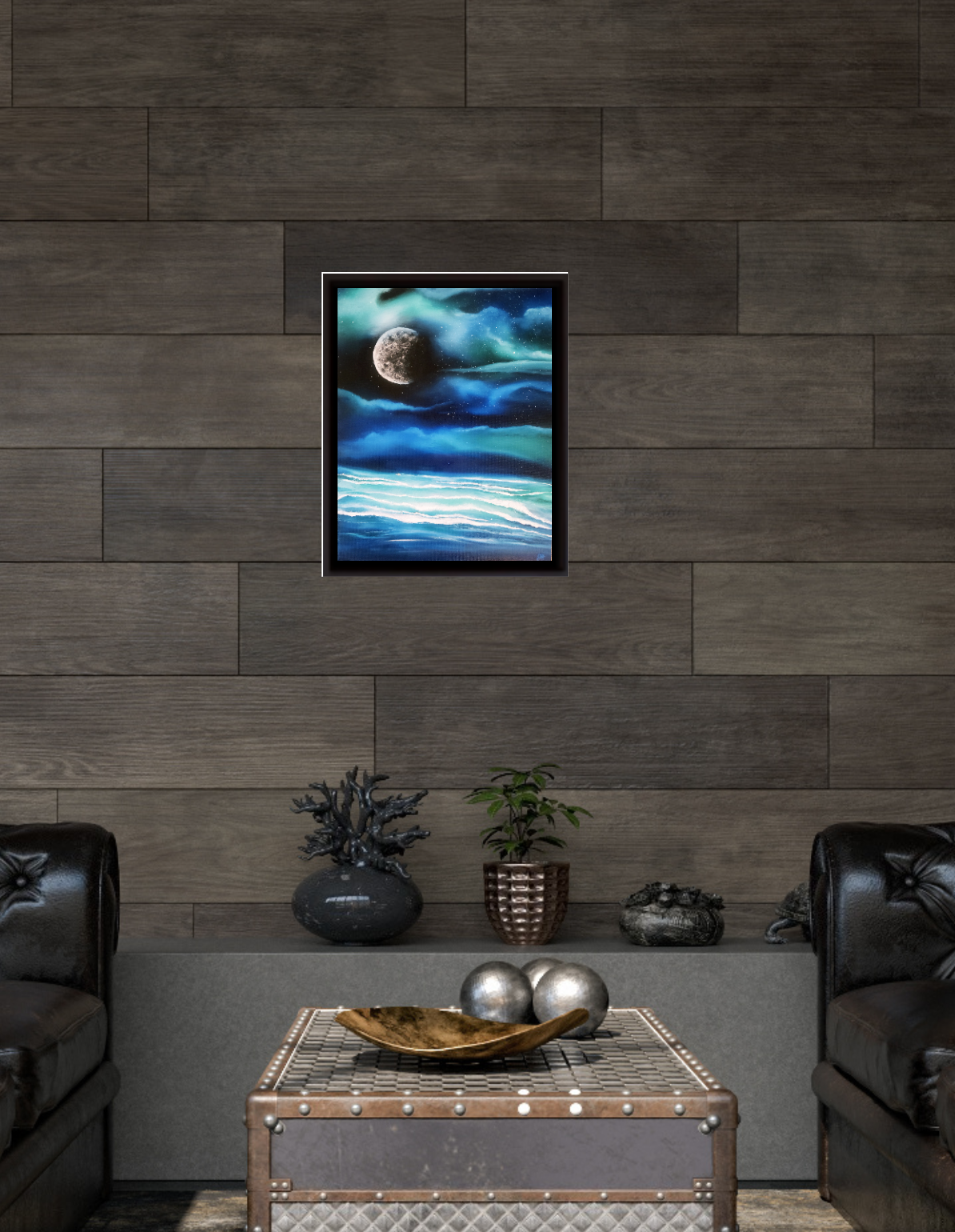 Hand painted oil painting on a canvas panel. The oil painting embracing the beauty of majestic skies and a close, detailed moon with its gliding waves. Blue and green hues are incorporated throughout this piece. Every piece is an original, ensuring no copies or prints exist. A black floating frame included. The price is adjusted to include cost of framing.