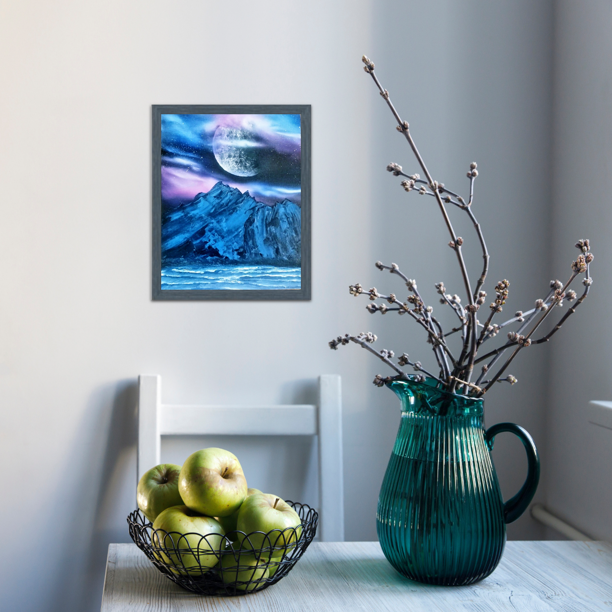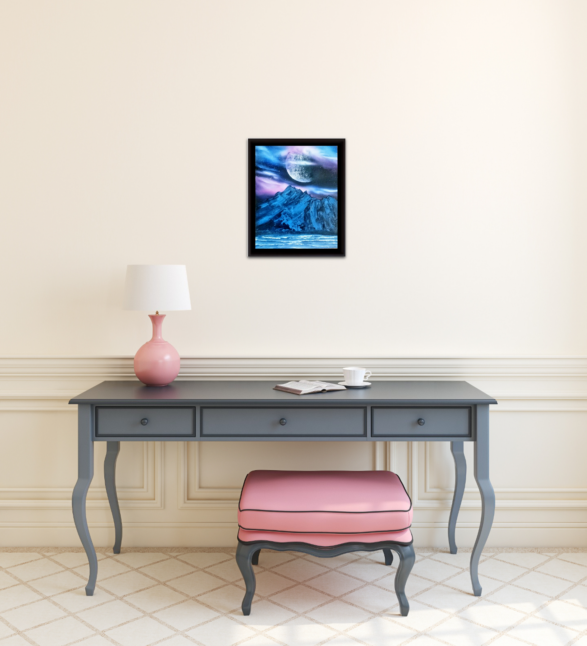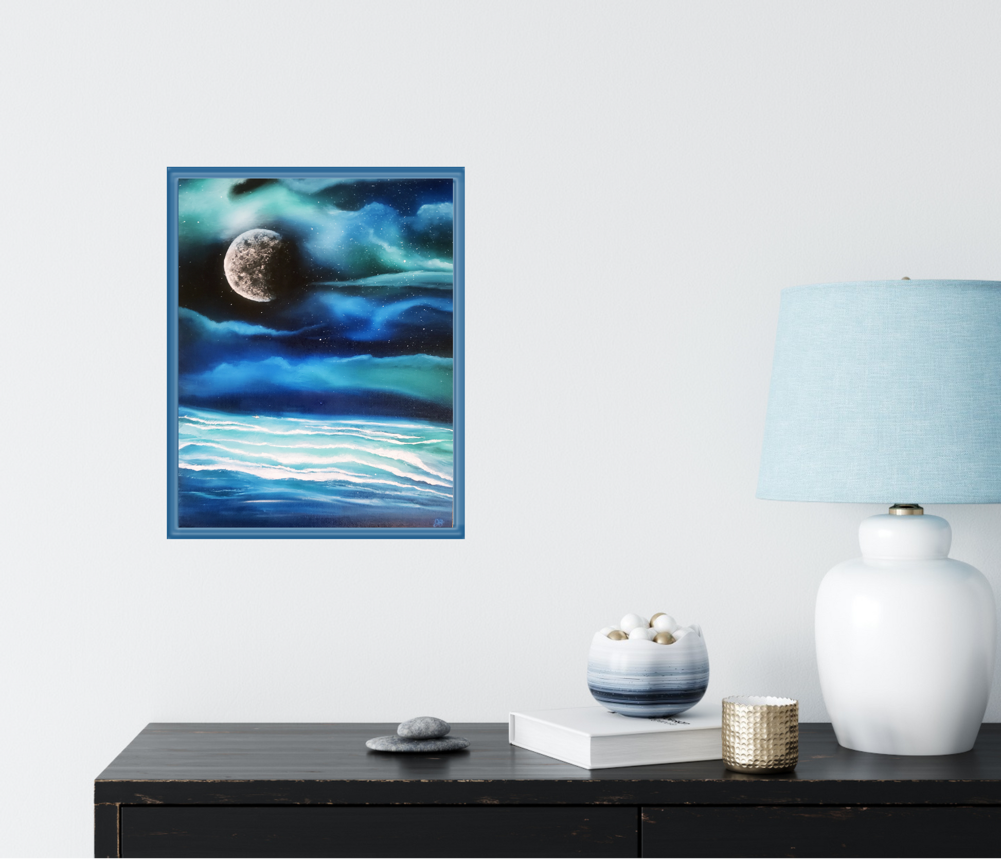 Hand painted oil painting on a canvas panel. The oil painting embracing the beauty of majestic skies and a close, detailed moon with its gliding waves. Blue and green hues are incorporated throughout this piece. Every piece is an original, ensuring no copies or prints exist. A black floating frame included. The price is adjusted to include cost of framing.