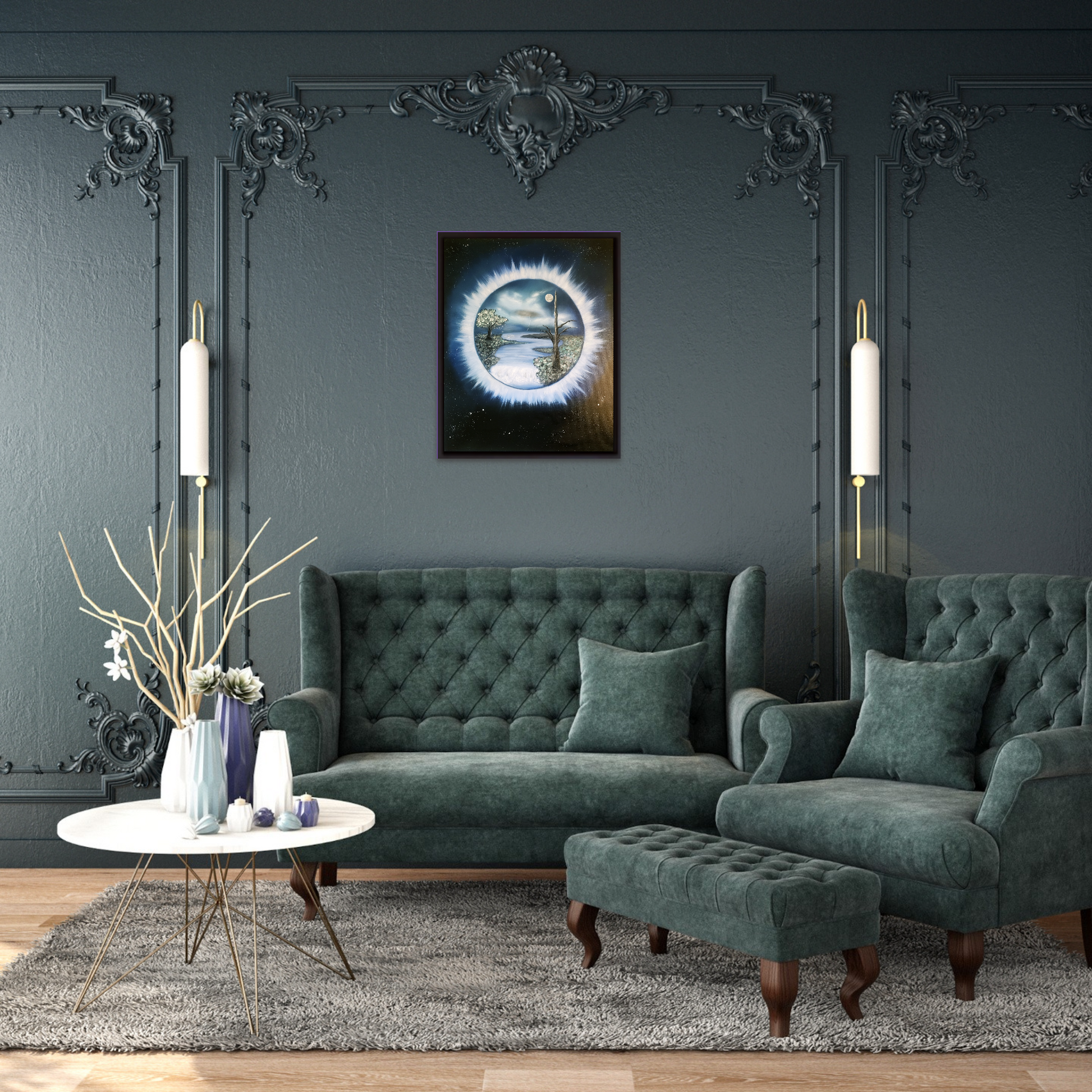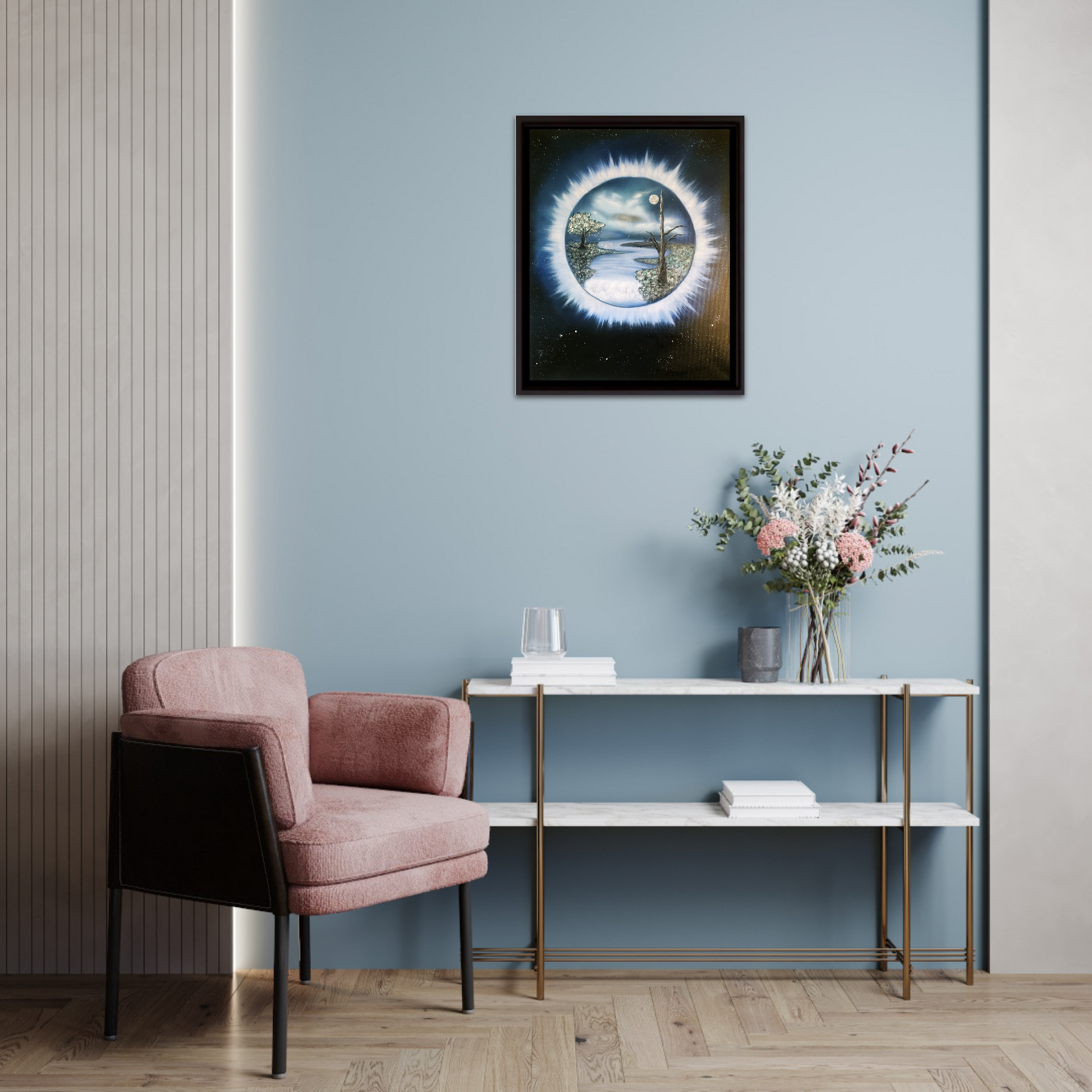 Hand painted Oil Painting on a canvas. The deep, dark corners of space depicted are alive with twinkling stars, creating a sense of vastness and mystery. The canvas texture is palpable under the fingertips, hinting at the artist's skillful strokes. The scene invites you to ponder where the portal might lead, its allure enhanced by the intricate details of this scene captured in high-quality oils.